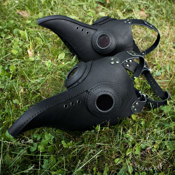 Маски чумного доктора, викторианская модель. Плотная фактурная кожа крс черного цвета, толстое цветное (темно красное) стекло в окулярах, ручной шов, металлическая фурнитура.