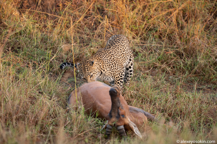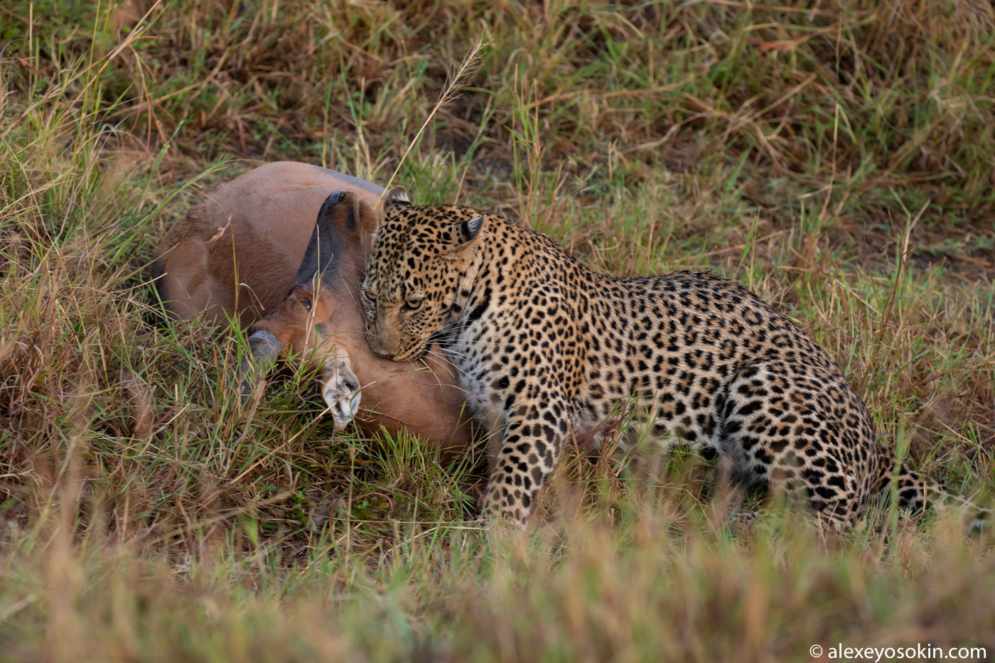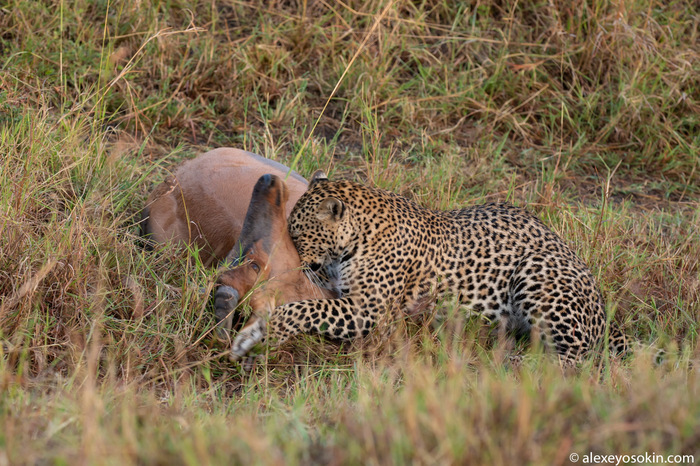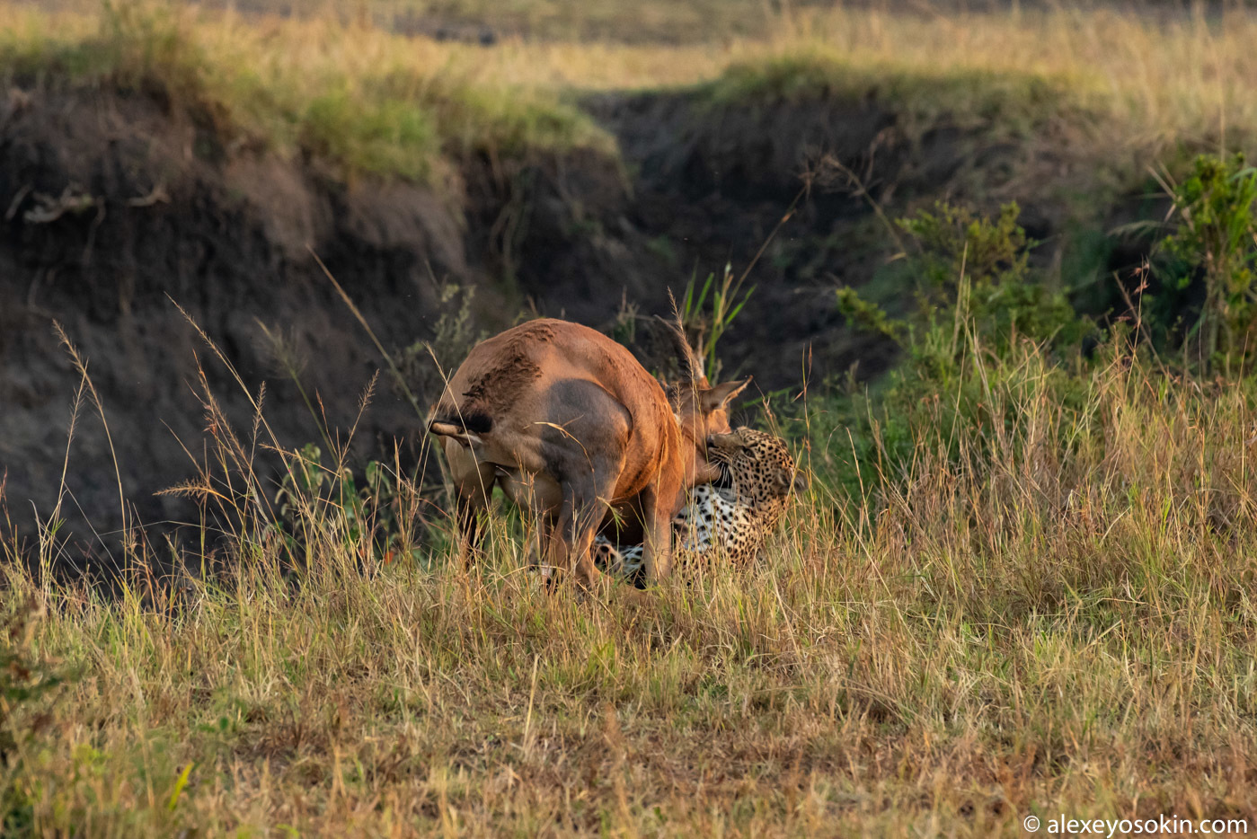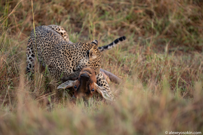 Интересно, что леопард сидел на холме, но при этом антилопы все равно не заметили ее, чем она и воспользовалась. Кошка прошмыгнула в овраг, низом подкралась к завтракающим антилопам и молниеносно атаковала одну из них, вцепившись в нее своими сильными лапами с острыми как ножи когтями и прокусив мощнейшей челюстью шею...