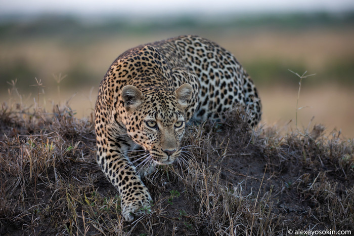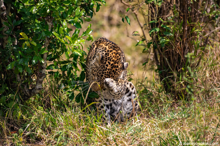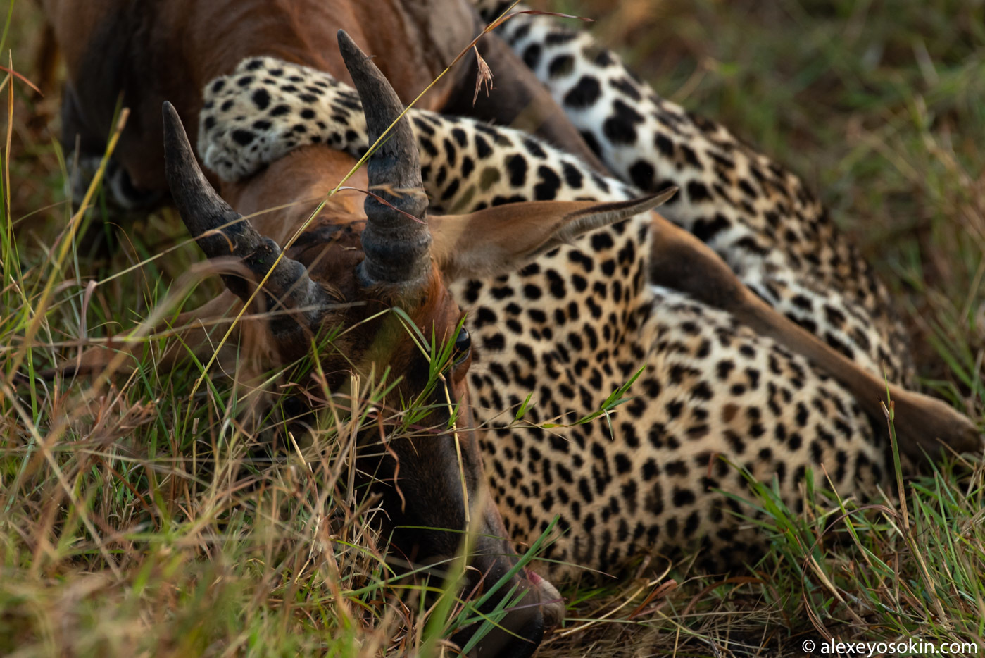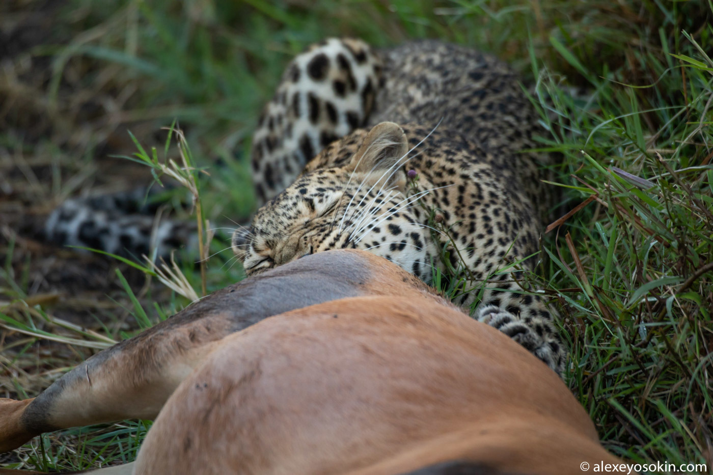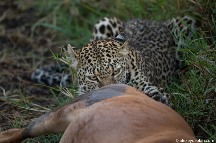 Интересно, что леопард сидел на холме, но при этом антилопы все равно не заметили ее, чем она и воспользовалась. Кошка прошмыгнула в овраг, низом подкралась к завтракающим антилопам и молниеносно атаковала одну из них, вцепившись в нее своими сильными лапами с острыми как ножи когтями и прокусив мощнейшей челюстью шею...