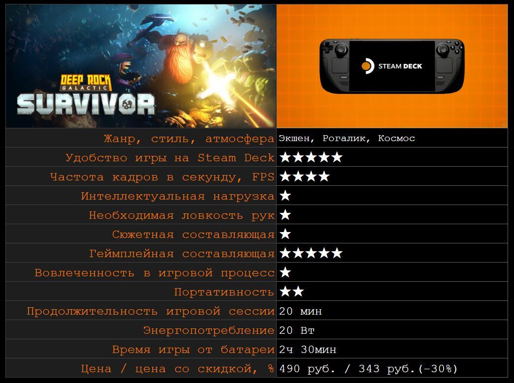 Deep Rock Galactic Survivor – Игру с более простым управление представить сложно, персонаж управляется одним любым пальцем (хоть ноги) на левом стике и кнопкой ‘A’ для выбора улучшений. Кнопка меню и ‘B’ (назад) - не в счёт. Автоматическое прицеливание и стрельба, остаётся только носится по поверхности уворачиваясь от полчищ жуков. Существенный минус – эти самые полчища загружают процессор и делают простую игру очень прожорливой, без зарядки можно играть менее 3х часов. Сюжета нет, головоломок нет, играть можно спинным мозгом, что позволяет параллельно слушать фильм, стрим и тп.