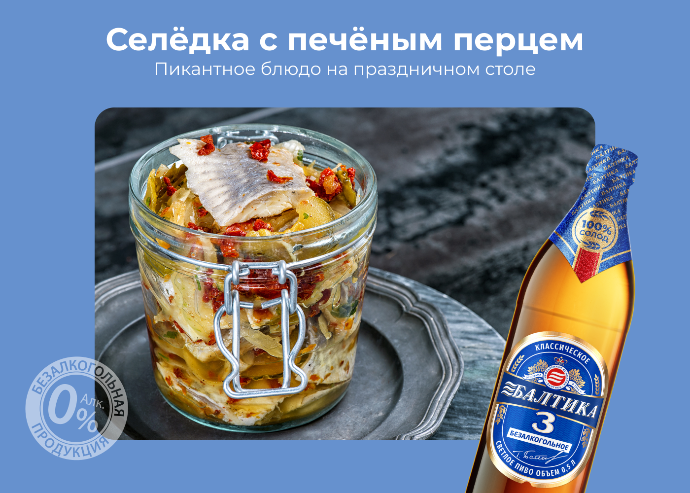 Отличная альтернатива «Селедке под шубой» для тех, кто не любит свеклу. Для приготовления вам понадобятся перец, лук, филе жирной сельди, сахар, уксус, оливковое масло, безалкогольное пиво Балтика 3.