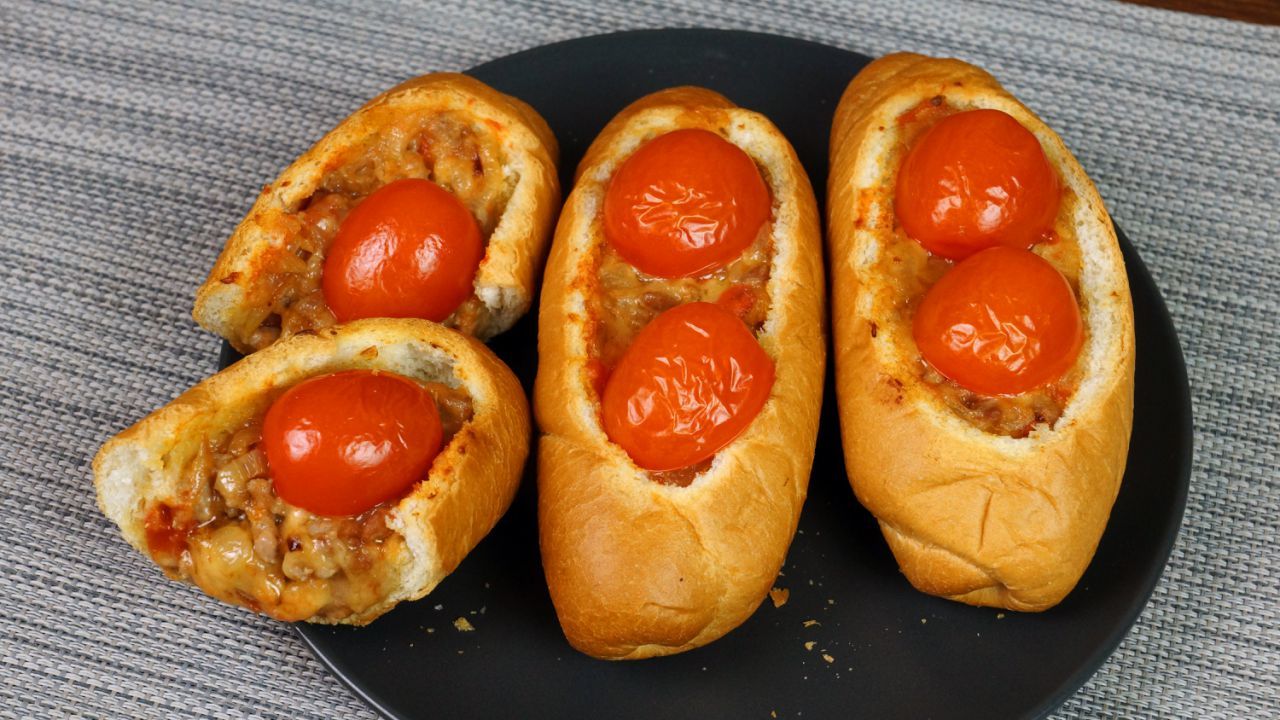Срезать верхушку у булочек для хот-догов. Избавить от мякиша середину. Смазать низ кетчупом. Натереть на мелкой терке небольшой кусок сыра. Смешать с теплым фаршем в 2 этапа, чтобы сыр не превратился сразу в комок. Переложить начинку в булочки. Сверху, для украшения, выложить пару половинок черри.Запекать в духовке минут 8-10.