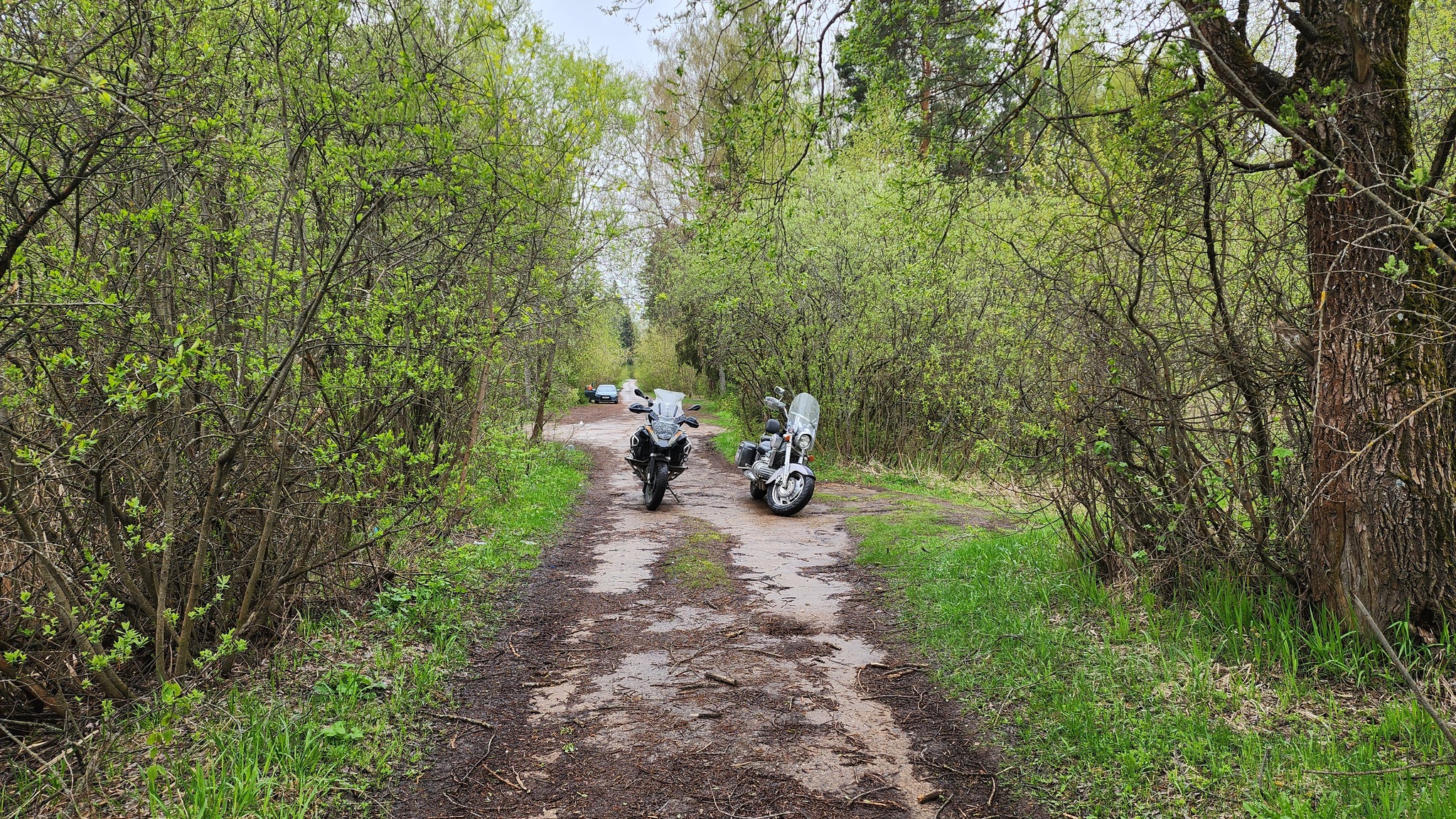 Что-то в этом конечно есть. Мы знаем, что дождевой фронт идёт нам навстречу. Мы могли бы никуда не ехать. Но мы в своём экипе настолько преисполнились, что нам уже не важно, есть дождь, нет дождя. Наш маршрут похож на начало из выпуска "Три шага от дома - вода" и вполне может быть исполнен и через родник "Тёщин язык" ( 55.720694, 37.191837 ), но мы едем по северному берегу реки. Всё очень просто - выбирайте извилистый путь, а не прямую магистраль - и вы повторите за нами и насладитесь свободными дорогами. До Звенигорода движение ещё есть, но благодаря майским несильное, после - совсем свободно. Дождь портит планы только тем, что с территории карьера выезжают грузовики, и как и год, два, три назад, они не моют колёса. Дорога в грязи и песке, Валькирия похожа на свинку, Гусь не отстаёт.