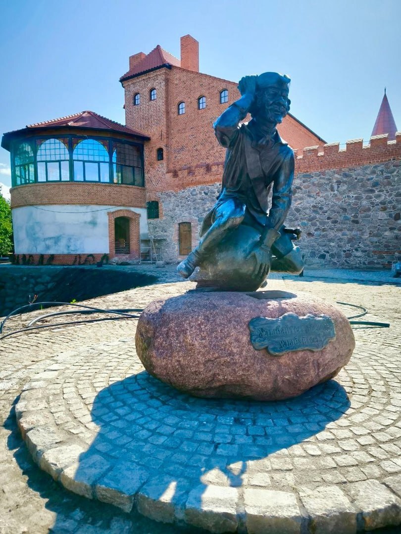 Бронзовый барон Мюнхгаузен продолжает полеты на ядре путешествия по Гурьевску, бывшему Нойхаузену. Вначале он приземлился в сквере возле городского парка, потом в самом парке, затем опять в сквере, после этого вернулся в парк (мог напутать, простите), а сейчас, смотрю, уже возле орденского замка Нойхаузен. Надеюсь, это уже надолго. А в замке говорят, все логично - Мюнхгаузен если даже и не бывал в замке, то, во всяком случае, над ним пролетал. На ядре.