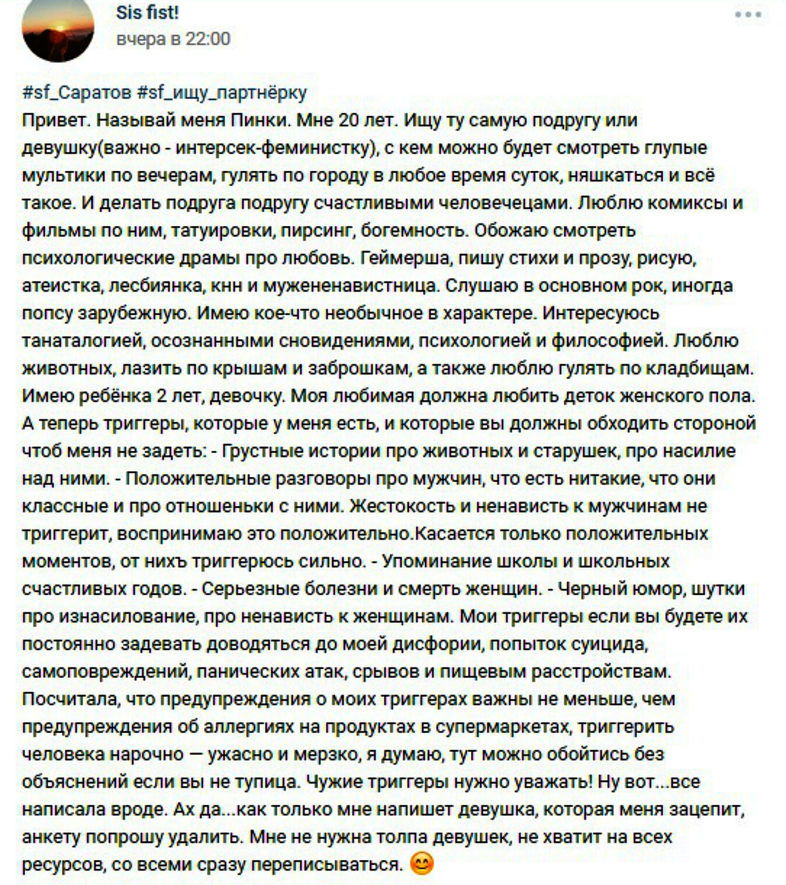 Просто интересно, если её будущая девушка в положительном ключе ненароком упомянет своего папаню или брата, данная особа из анкеты сразу побежит вены резать и в истерику впадать? И если у девушки случатся проблемы со здоровьем или к неё применят насилие, тоже нельзя будет рассказать ей, чтоб не триггернуть недайбох?
