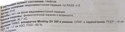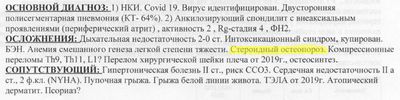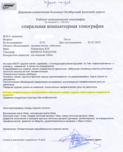 Меня собирают, грузят обратно на каталку и минуя приёмный покой везут сначала на КТ, а потом сразу в реанимацию (ОРИТ). Врачи больницы, делавшие КТ, видят 64% поражения лёгких и «отсутствие деструктивных и травматических изменений костей в зоне сканирования». Потом неделя медикаментозной комы, нИВЛ, после прон-позиция на правом боку и животе, 18 дней в самом ОРИТе. Ещё одно КТ — снова без «деструктивных и травматических изменений костей».