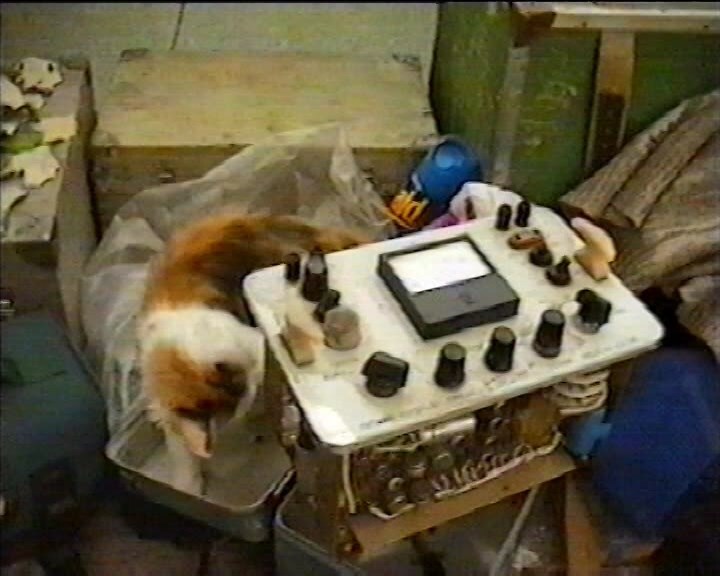 Аппаратура сохнет, а Муська, котёнок привезённый студентами, старательно пытается его уронить. Скрин из видео, поэтому качество так себе.
