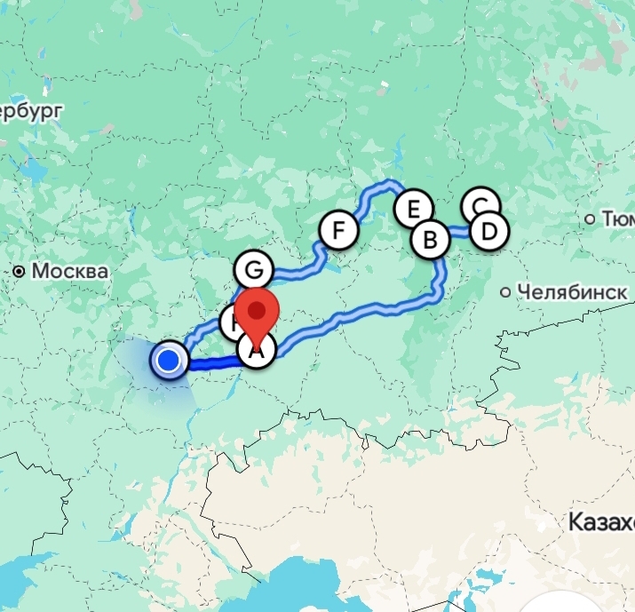 Пенза-Тольятти-Уфа-Первоуральск-Ньвьянск-Екатеринбург-Кунгур-Пермь-Ижевск-Казань-Ульяновск-Пенза. Такое своеобразное "золотое кольцо" в центре России.
