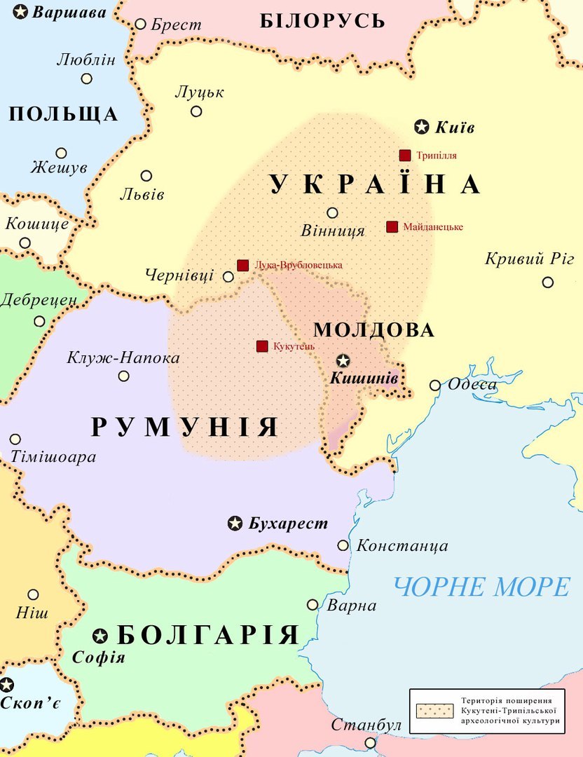 Кроме того, самые старые артефакты культуры были обнаружены в Трансильвании. Выходит, что Триполье на территории Украины было только восточным форпостом этой культуры, растянувшейся от Трансильвании до среднего Днепра, от Волыни до побережья Черного моря.