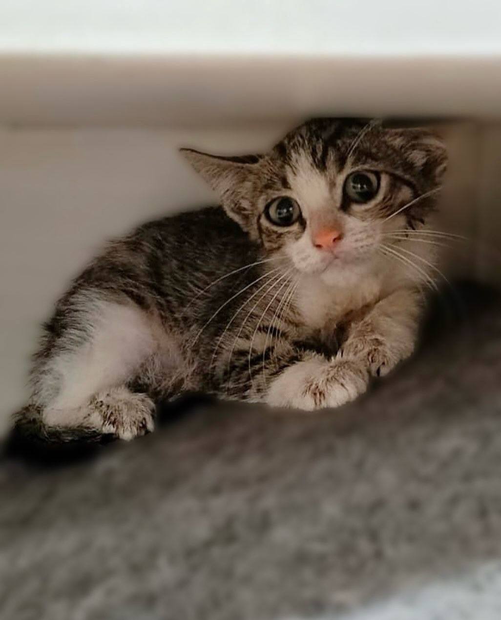 Фунтику приходилось ходить лапками по раскаленным камням. В итоге котёнок получил ожоги, сейчас с подушечек слазяет кожа. Волонтёры не смогли остаться в стороне и Фунтика привезли в Москву.