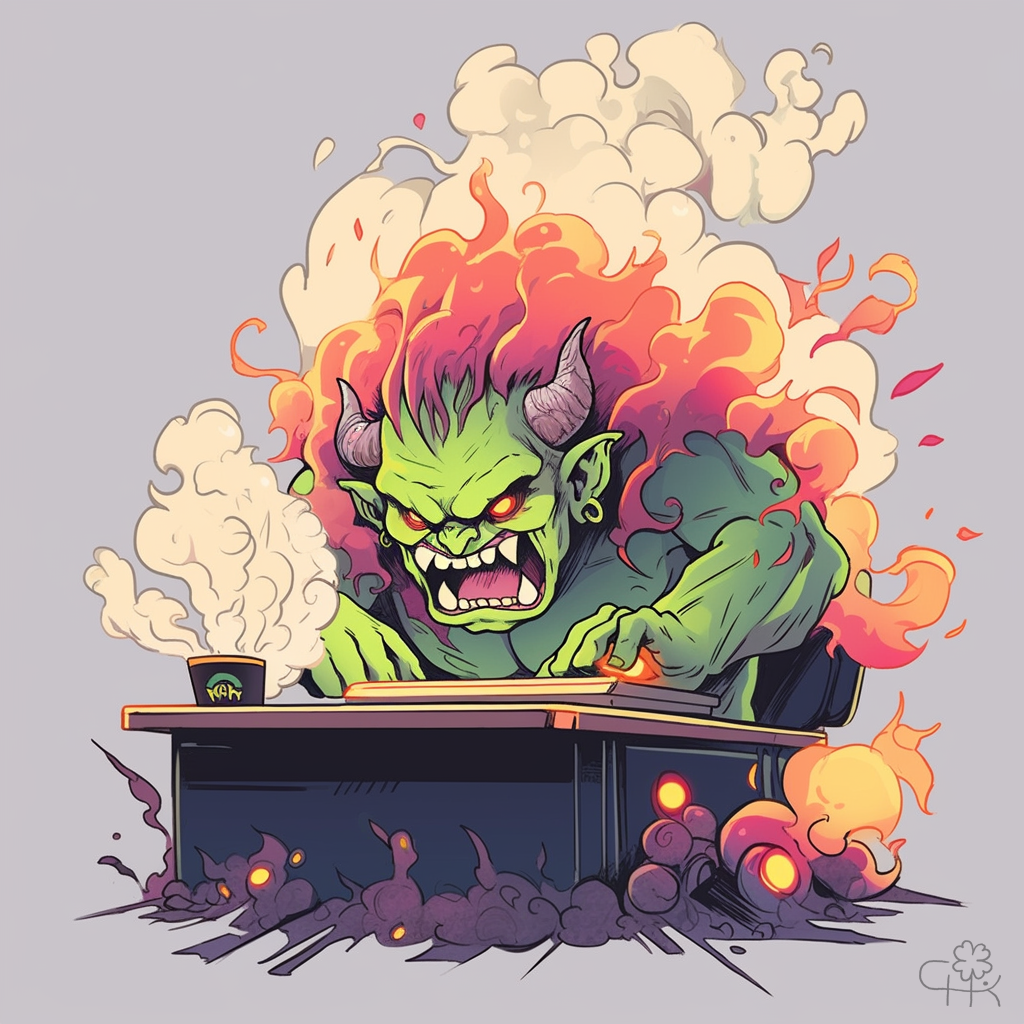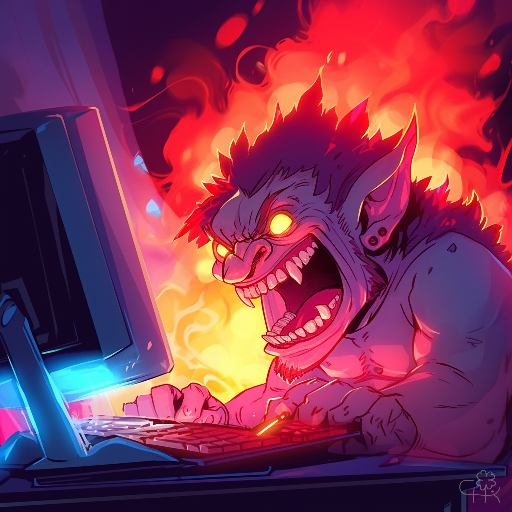 Промпт: A cartoon depiction of a viciously funny and nasty troll, at a computer, spitting spittle, with smoke coming out of his ears, writing vicious comments