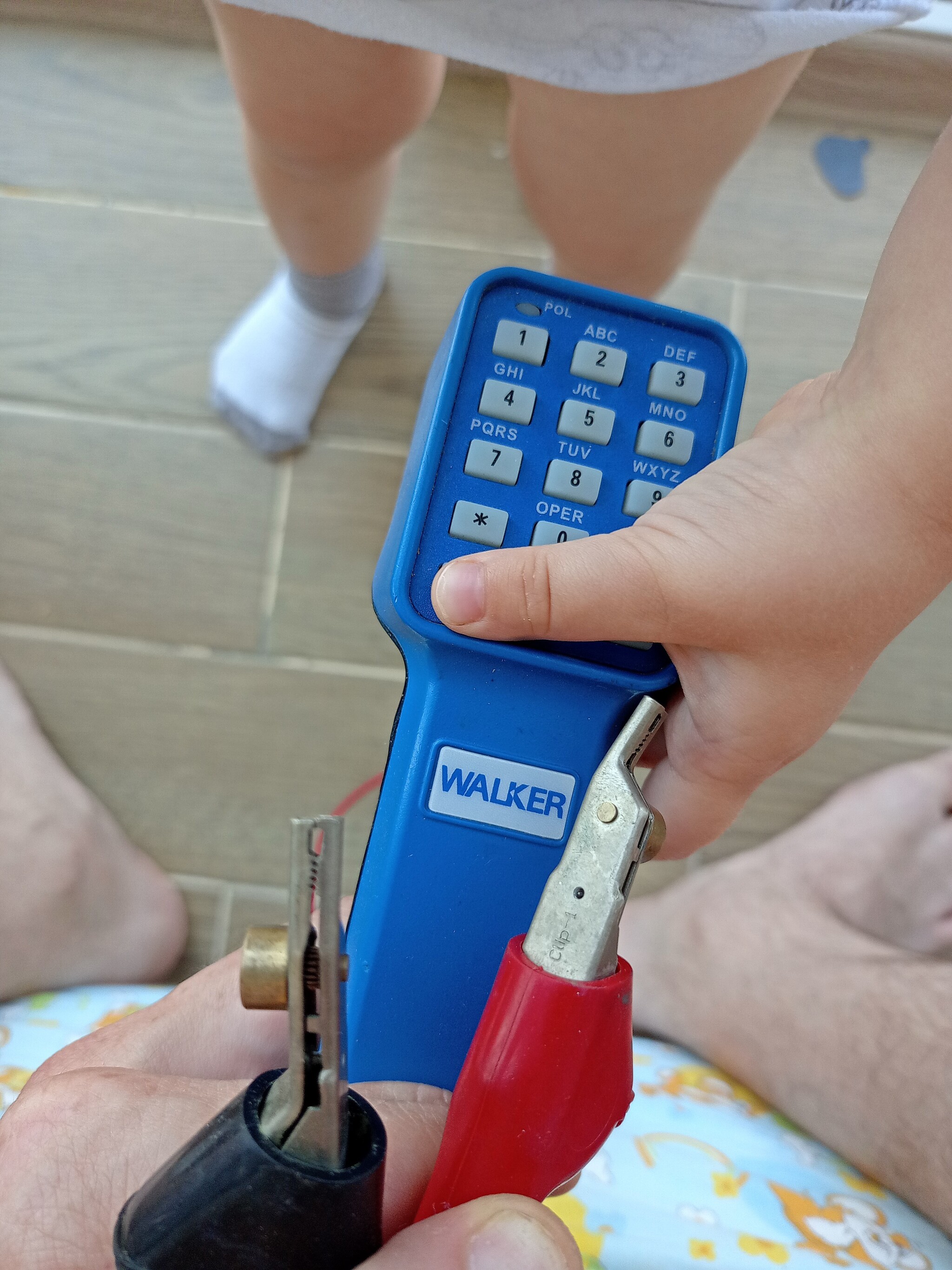 Этот уникальный "телефон" служит для наладки телефонных сетей. Позвонить на него нельзя, но можно позвонить с него. Сзади есть выключатель. На конце провода должны быть крокодилы, но мне достался с обрезанным хвостом.