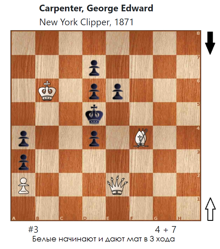 11 scootin Шахматы Трёхходовочка #155 1 год назад Сегодня трёхходовая задача американского шахматного композитора Джорджа Эдварда Карпентера (George Edward Carpenter, 1844 - 1924) из американского печатного издания "New York Clipper" за 1871 год. Шахматы Шахматные задачи Задача Головоломка Ещё 0