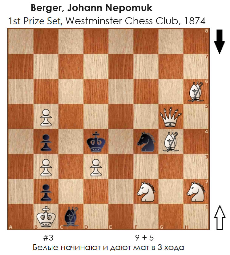 13 scootin Шахматы Трёхходовочка #156 1 год назад Одна из трёх композиций, с которыми австрийский проблемист Иоганн Непомук Бергер (Johann Nepomuk Berger, 1845 - 1933) победил в турнире Вестминстерского Шахматного Клуба в 1874 году. Шахматы Шахматные задачи Задача Головоломка Ещё 0