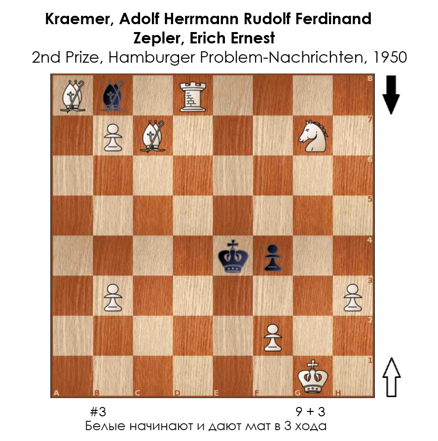 Совместная работа двух немецких шахматных композиторов Адольфа Германа Рудольфа Фердинанда Кремера (Adolf Herrmann Rudolf Ferdinand Kraemer, 1898 - 1972) и Эриха Эрнеста Цеплера (Erich Ernest Zepler, 1898 - 1980), с которой они заняли второе место на турнире печатного издания "Hamburger Problem-Nachrichten" в 1950 году.