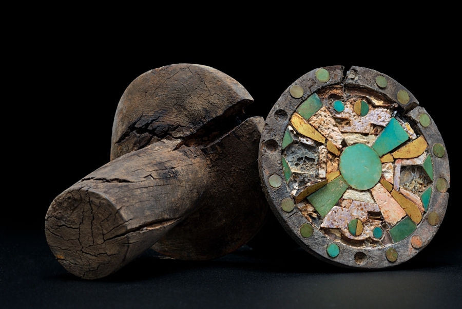Ушные украшения, инкрустированные золотом, кусочками морских раковин и драгоценными камнями.