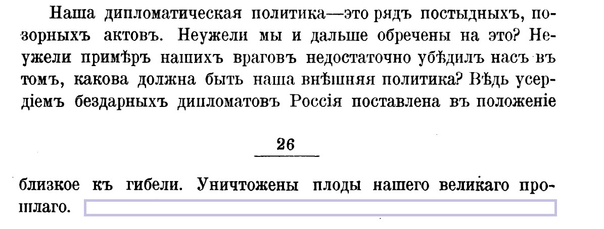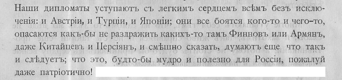 "Дипломатическая катастрофа является разгромом нашего морального влияния. С нашей катастрофой неразрывно связано усиление германизма на Балканском полуострове. Наша дипломатия не сумела помешать соглашению Австрии с Турцией, и государственная власть обнаружила свое бессилие, а руководители ее в дипломатической области проявили трусость."