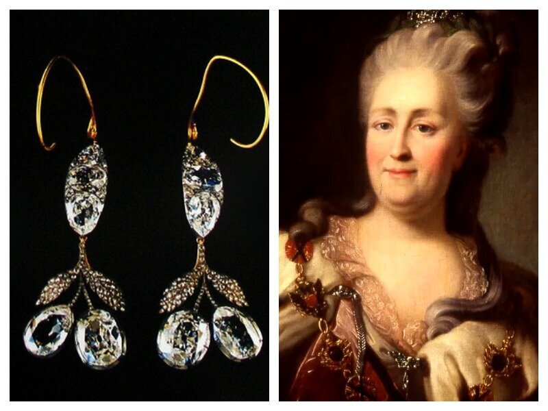 Очень неожиданно было узнать что для Императрицы Екатерины II в 18 веке придворные ювелиры изготовили серьги в виде вишенок. Точнее, огромных вишен из бразильских бриллиантов: по 11 и 7 карат. Серебряные листочки украшены россыпью мелких камней.