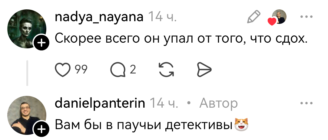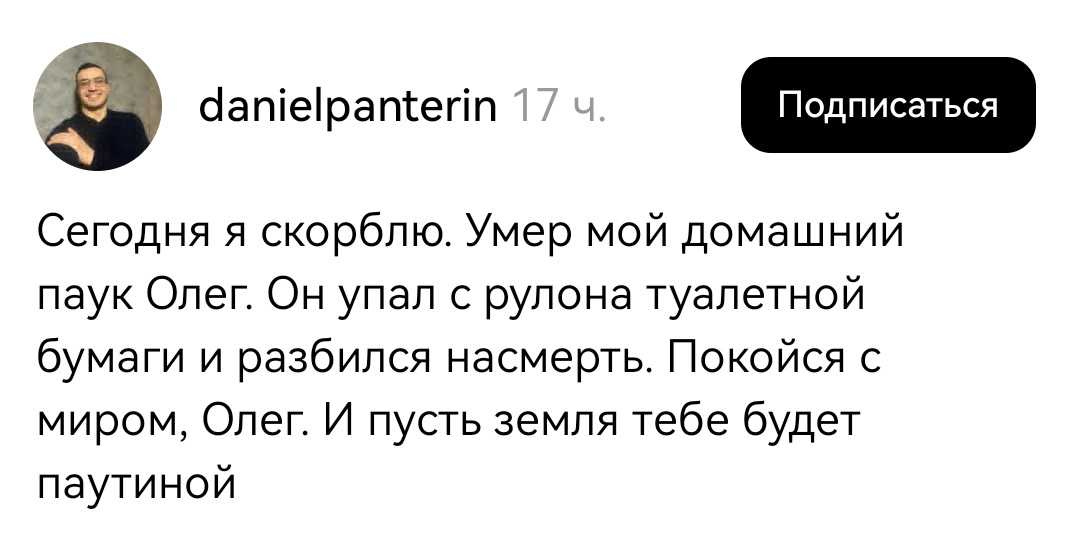 1365 supasheff Юмор Царствие паучье, Олегу1 3 дня назад Скриншот Комментарии Юмор Паук Threads Длиннопост 181 9 2 2 2 1 1 1 Ещё 3