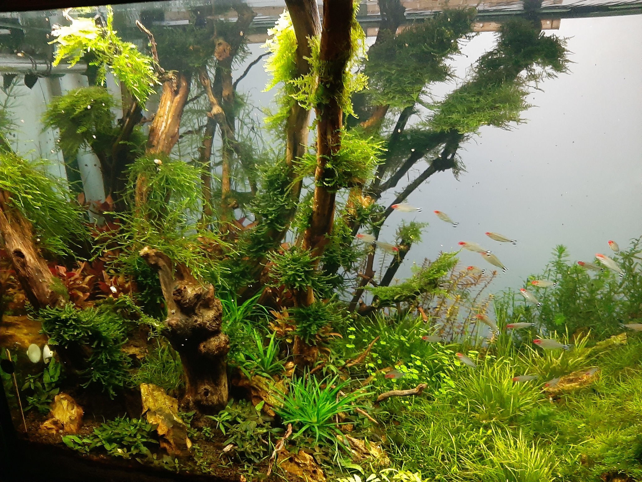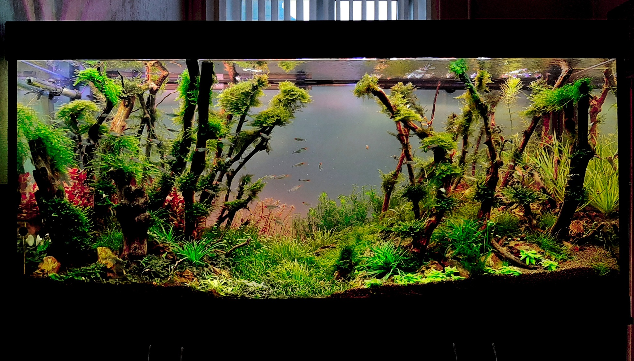 500 литровый аквариум. Запущен в октябре прошлого года. Растет неспешно. СО.2 не подается, полсотни родостомусов и неимоверное количество креветок - неокаридин "блюдрим". Запустил их полсотни. Сейчас ровным ковром покрывают всю растительность. Не пора ли призвать Малифисенту?