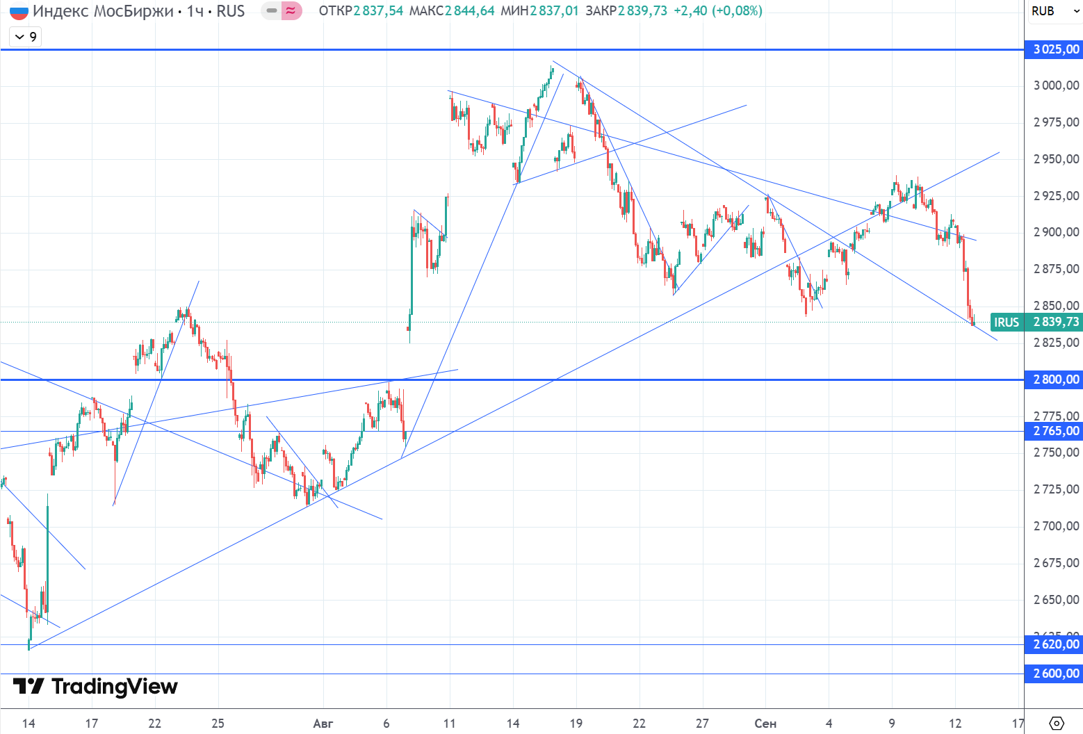 В целом, рынок акций довольно долго разворачивался вниз. О пробое линии глобального аптренда и переходе рынка к более глубокому падению в сторону уровня 2800 (а также о возможном его пробое) писал еще в еженедельном обзоре пару недель назад. И хоть индекс и пытался снова вернуться в аптренд, перейдя в боковик, цена все равно не смогла закрепиться выше трендовой, что привело снова к откату и пробою уровня 2900, который должен был привести к ускорению падения, что мы вчера и увидели.