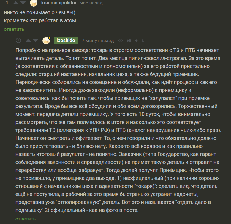 12 AVzVA Целая стадия уголовного процесса в одном комментарии 6 лет назад Взято отсюда #comment_145908727 Уголовное дело Следователь Прокурор Комментарии на Пикабу Суд