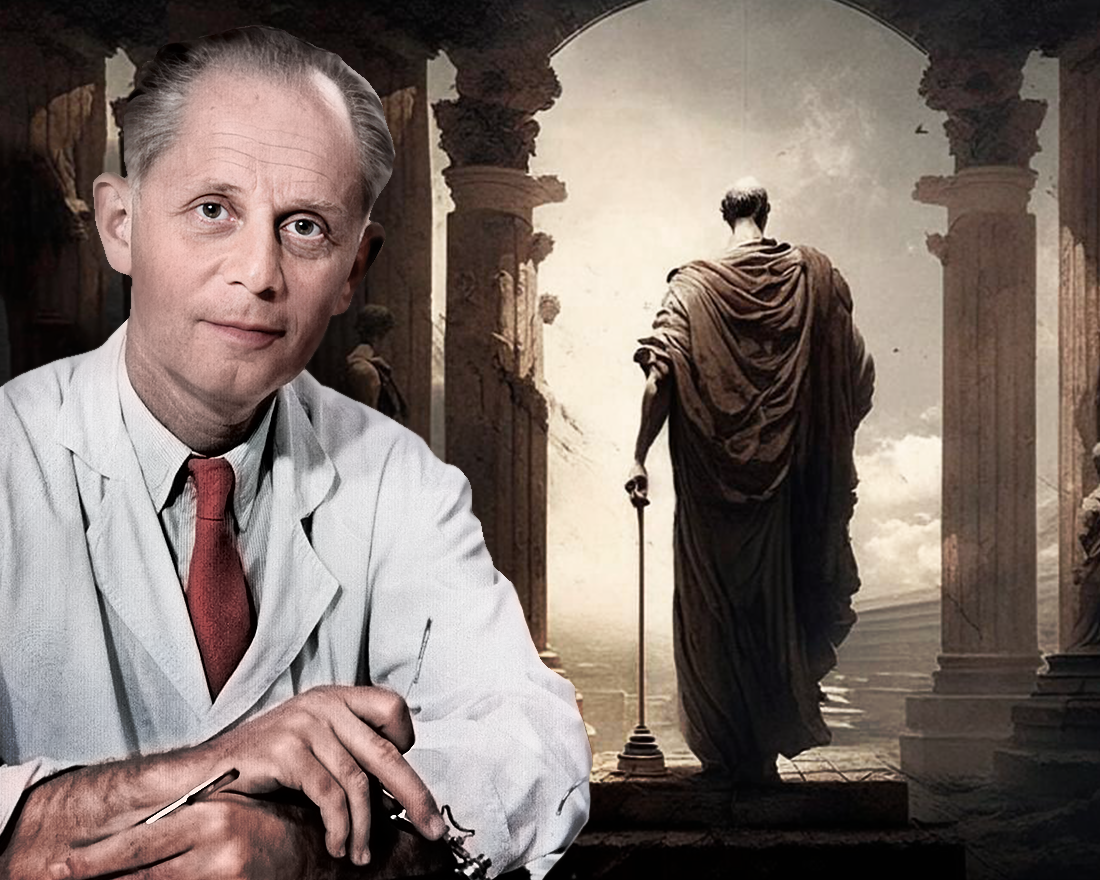 Ганс Селье — канадский физиолог. Разработал теорию стресса / ШколаЖизни.Ру & На фоне — картинка сгенерирована нейросетью Kandinsky 2.1 от Sber AI по текстовому запросу