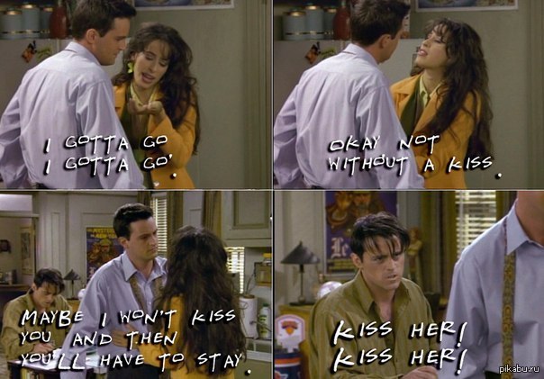 3 dalnoboishik Целуй её, целуй 11 лет назад Мне пора. Только сначала поцелуй меня. Если не поцелую, тогда ты останешься? Целуй её, целуй! Сериал Друзья Дженис Джоуи Триббиани