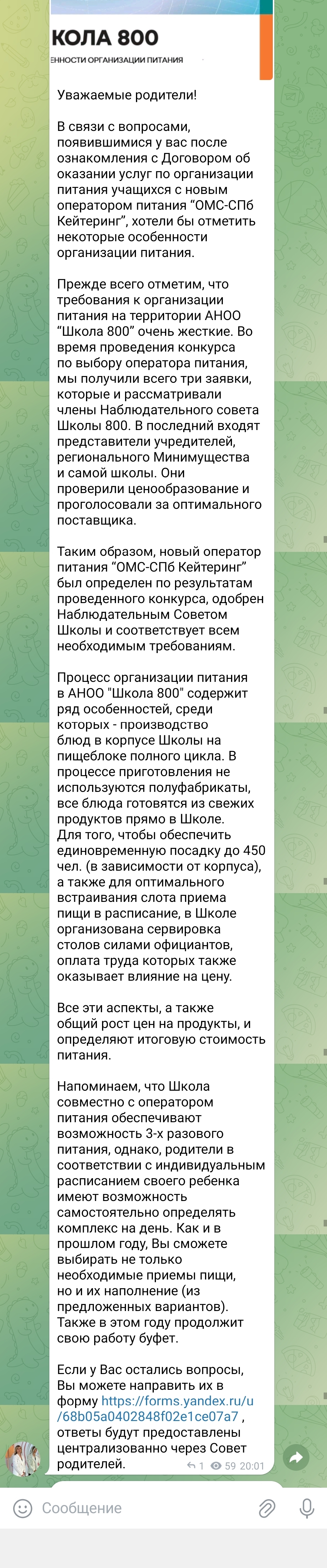 Это результат прихода в "Школу 800" нового организатора питания — компании "ОМС-СПб Кейтеринг" (питерские, но с юридическим адресом в подмосковных Химках). Хотя на сайте школы по-прежнему указан старый поставщик школьной еды — компания "Здоровое питание" (см. скриншот сайта).