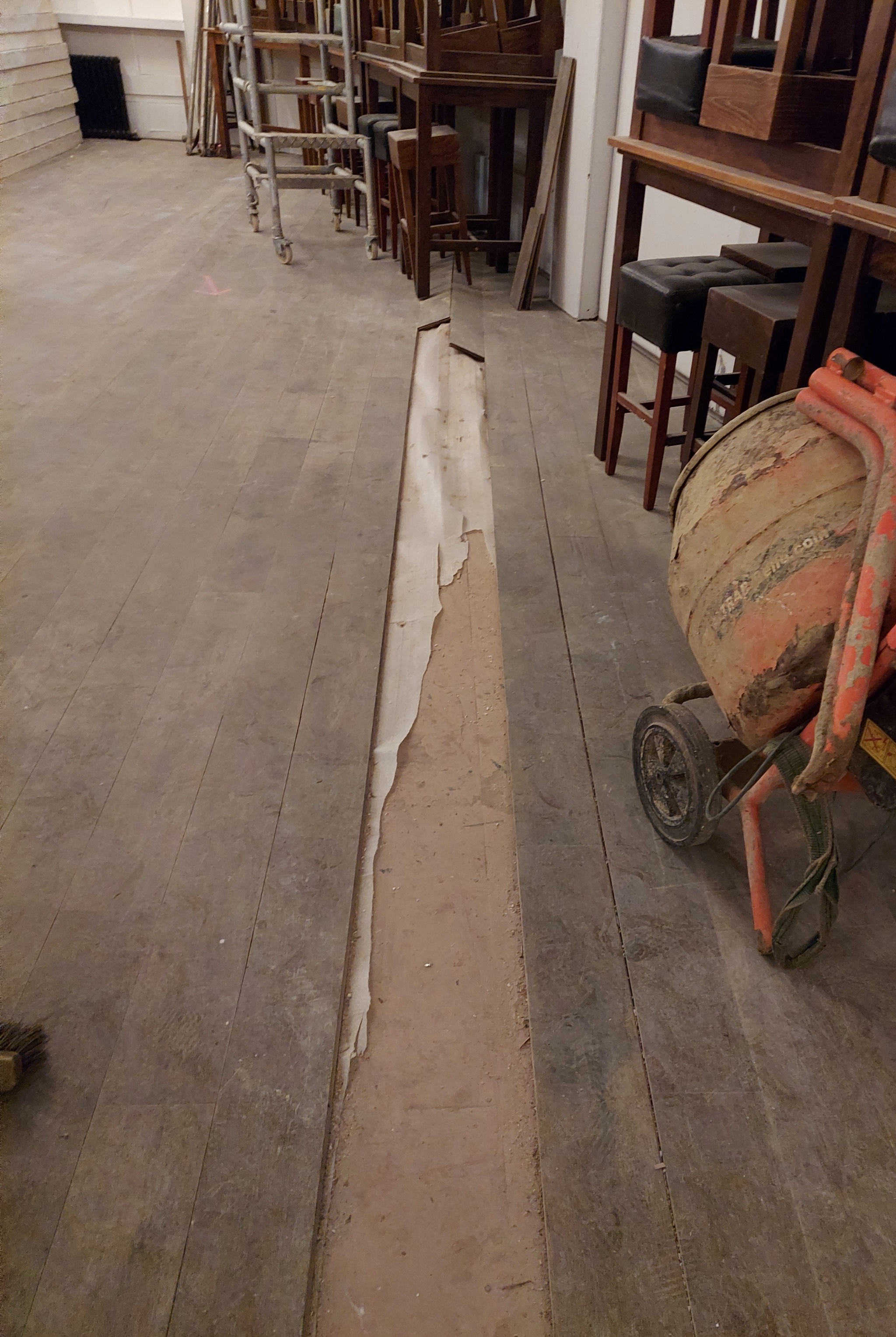 Строители (не понятно по какой причине) до конца не закончили свою работу, и дождевая водица 5 месяцев затекала по этой стене в паб. Весь угол паба был мокрый, и дождевая вода потихоньку залила весь пол.