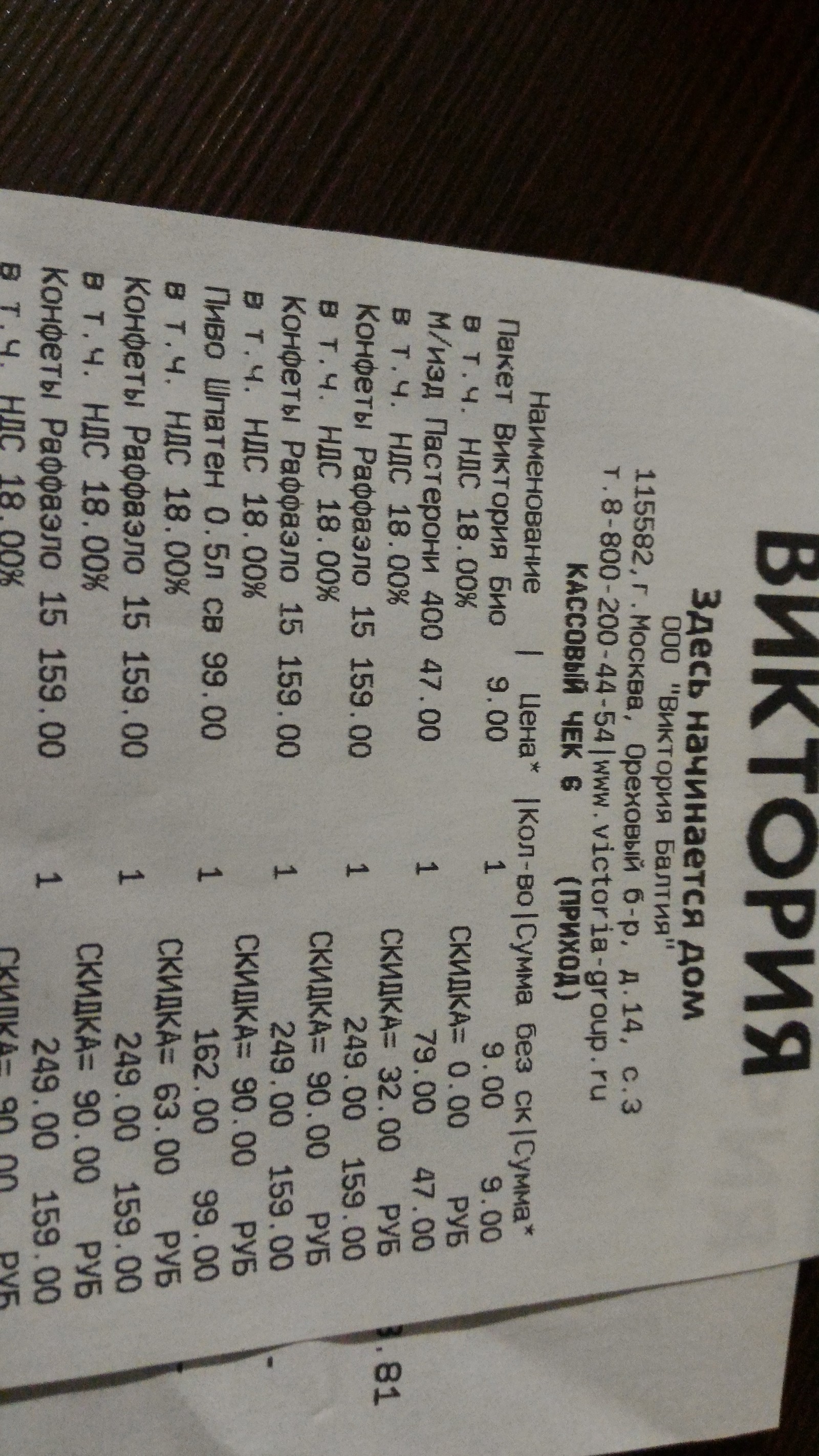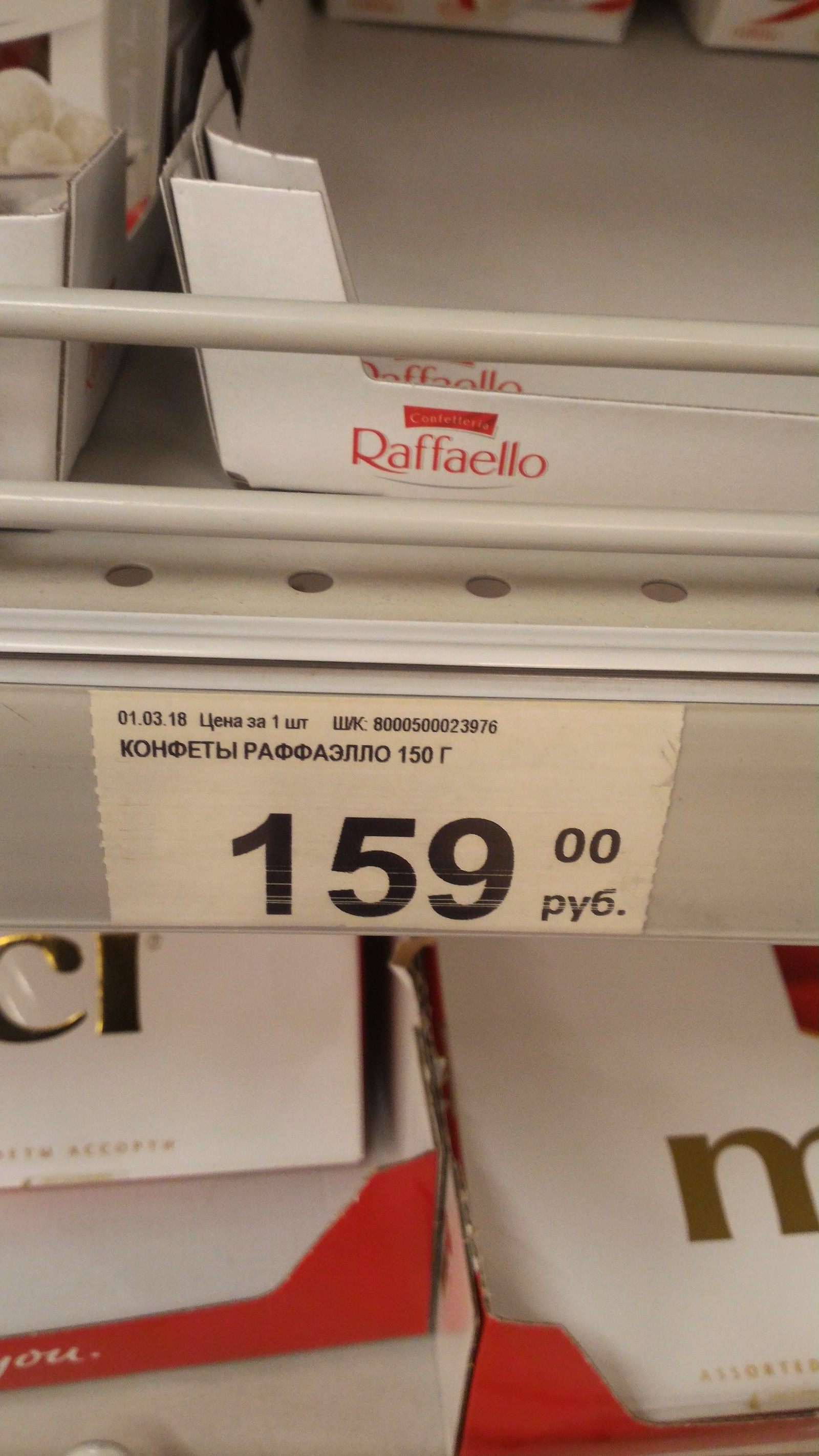 Пользуюсь данной сетью магазинов, благодаря расположению. Удобно, вышел из метро, магазин, маршрутка, дом. Никуда ходить ненадо. Ну и цены вполне демократичные при уровне сервиса. В общем вполне хорошая сеть супермаркетов. Но периодически бывают у них заскоки. Как то фоткал скидочную аква минерале 0,5 с доскидочной ценой больше 100 рублей. Сейчас вот жена рафаэлок попросила купить. Увидел коробки на положенном им месте в отделе конфет, цена вполне удовлетворительная, 150 с чем-то. Взял и пошел дальше. К середине зала наткнулся на стенд с рафаэлками со скидкой. О, думаю не по 150 возьму, а со скидоном, можно и по больше взять, все равно потом опять брать, а так сэкономлю. Смотрю а цена 159 рублей со скидкой, без 246. Вернулся проверить, не попутал ли чего и точно ли я их по 150 с лишним брал, а не по 300. Да, ценник гласит 159. Сфоткал чтоб жене рассказать на конкретном примере о маркетинге и наебалове.пришел, рассказал о том как конфеты в период с 1го по 8е успели подорожать на 35%, но так и быть, сделаем вам скидку 9го числа. А жена мне и говорит, что по чеку они вобще 249. И вот вроде и стоили 159 и купил по 159, но вот чувствую, что наебать пытаются. Причем как-то не прикрыто и так не аккуратно, что даже обидно.