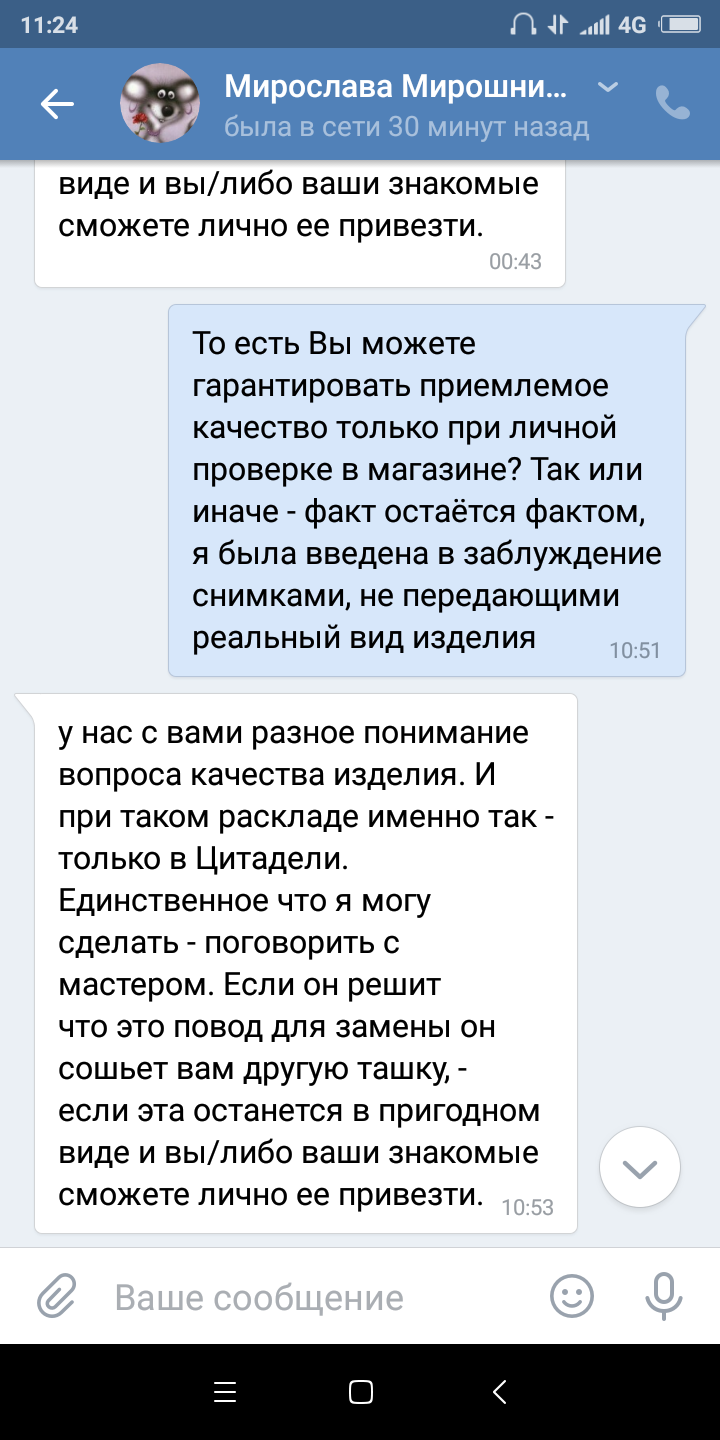 В итоге что мы имеем - либо проверяйте лично, либо мы не несём ответственности, а мы разве что соизволим сообщить мастеру, и может быть, он поменяет изделие, если сочтет нужным и если вы, конечно, доставите сумку из другой страны.