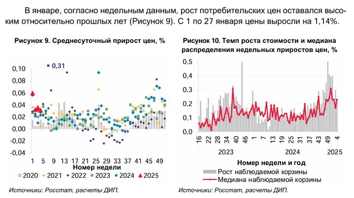 Центробанк России повышал в прошлом году ключевую ставку, которая достигла максимального уровня за последние 12 лет. Однако эти меры пока не принесли ожидаемого эффекта. По данным регулятора, в декабре инфляция ускорилась до 9,5%, а годовой рост цен на продукты превысил 11%, установив антирекорд за последние девять лет. В официальном докладе Банка России "О чем говорят тренды" от февраля 2025 года отмечается, что признаки стабилизации цен отсутствуют.