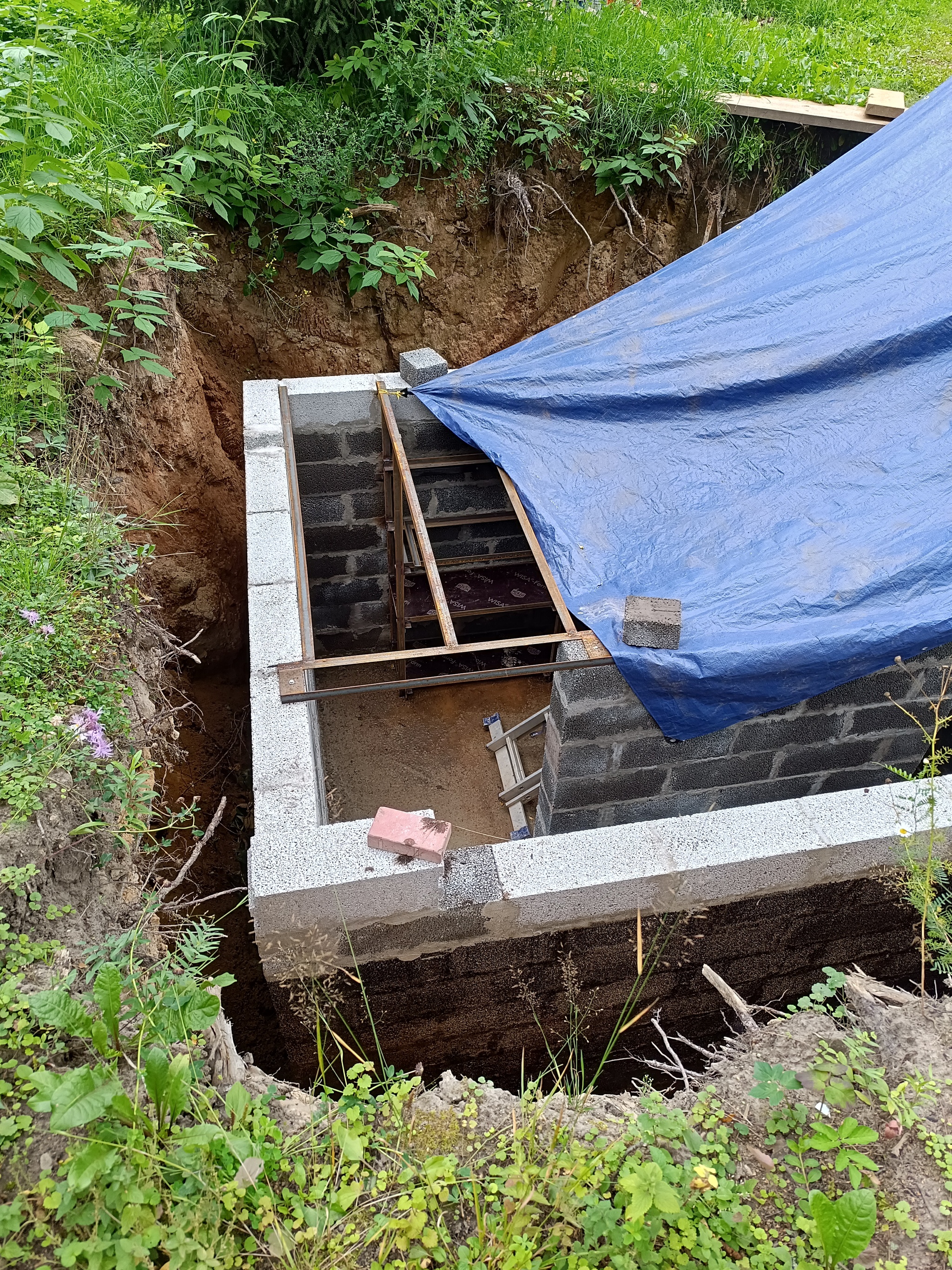 Плита встаёт около двух недель, в это время да, все разъехались по морям и санаториям. Далее идёт кладка стен, опускать мешалку внутрь не вариант, потом хер вытащишь, значит делаем сходы и таскаем ручками. Отбиваем по уровню каждый слой кладки, как по учебнику, строим для себя. Начиная с уровня 4-5, начинается самое веселье ибо надо не только кладку делать, но сразу и гидроизол наносить с внешней стороны, потом это сделать нереально, яма слишком узкая. После вывода стен необходимо построить (сварить) внутри полки, сверху на полки и стены уложить несъёмную опалубку, сделать опять обвязку арматуры и начать выводить рукав для спуска, не забываем заранее сварить частично лестницу, потом внутри дышать от сварки будет тяжко. Вторая плита залита, встаёт, доводим рукам спуска до конца, делаем ему крышу, понимаем, что трактором закапывать вообще не вариант ибо внутри вынутого грунта валуны весом этак от 500 кг и выше. Самые мелкие до сих пор валяются, отбойный молоток вышел из строя. Возим землю тачками 2 недели. Ждём изготовления пластиковых дверей их там две. Вставляем двери и ведём проводку. Крепким светильники и розетки внутрь погреба.