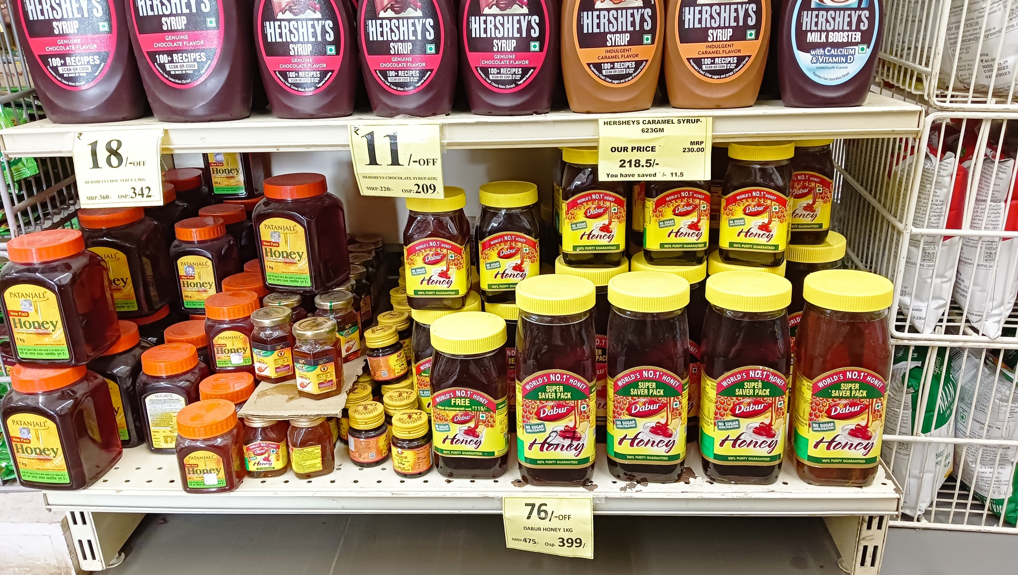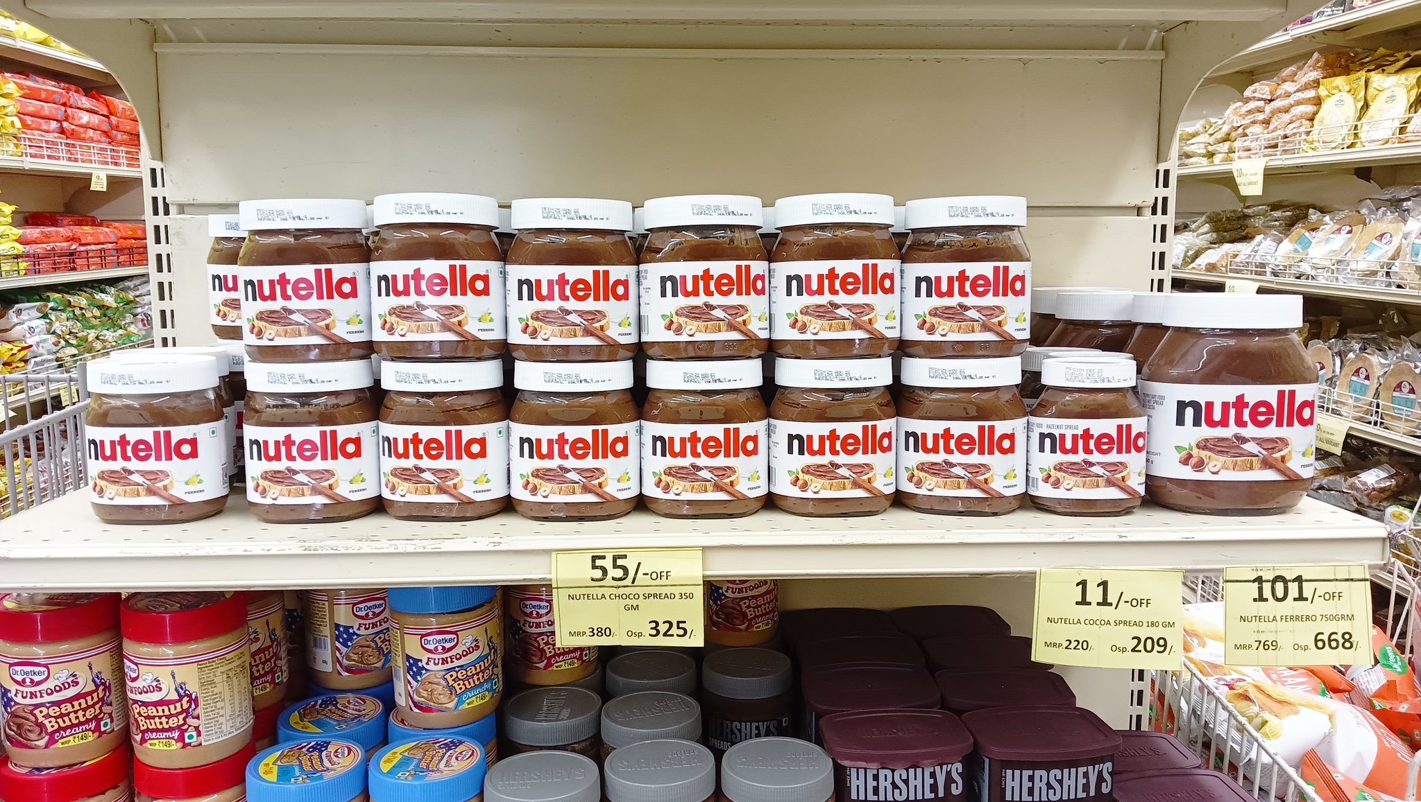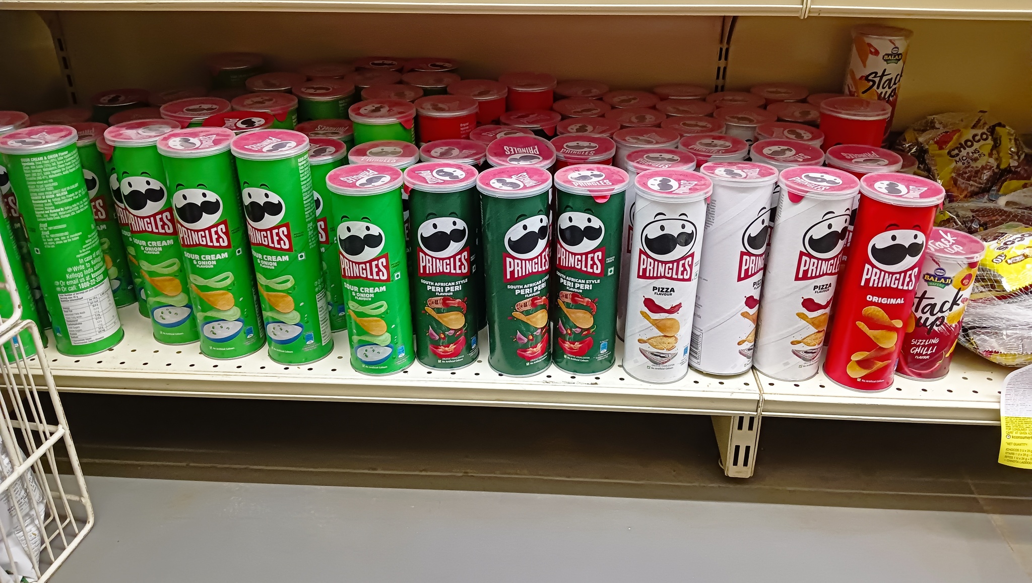 На глаза попались банки с нутеллой, Pringles и медом. Pringles по 115 рупий за упаковку.