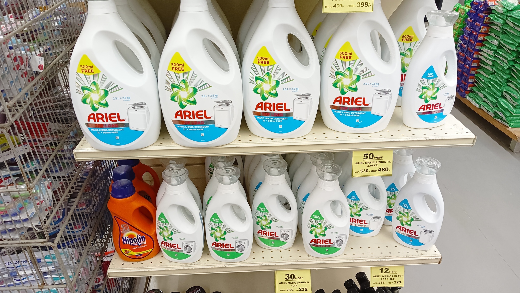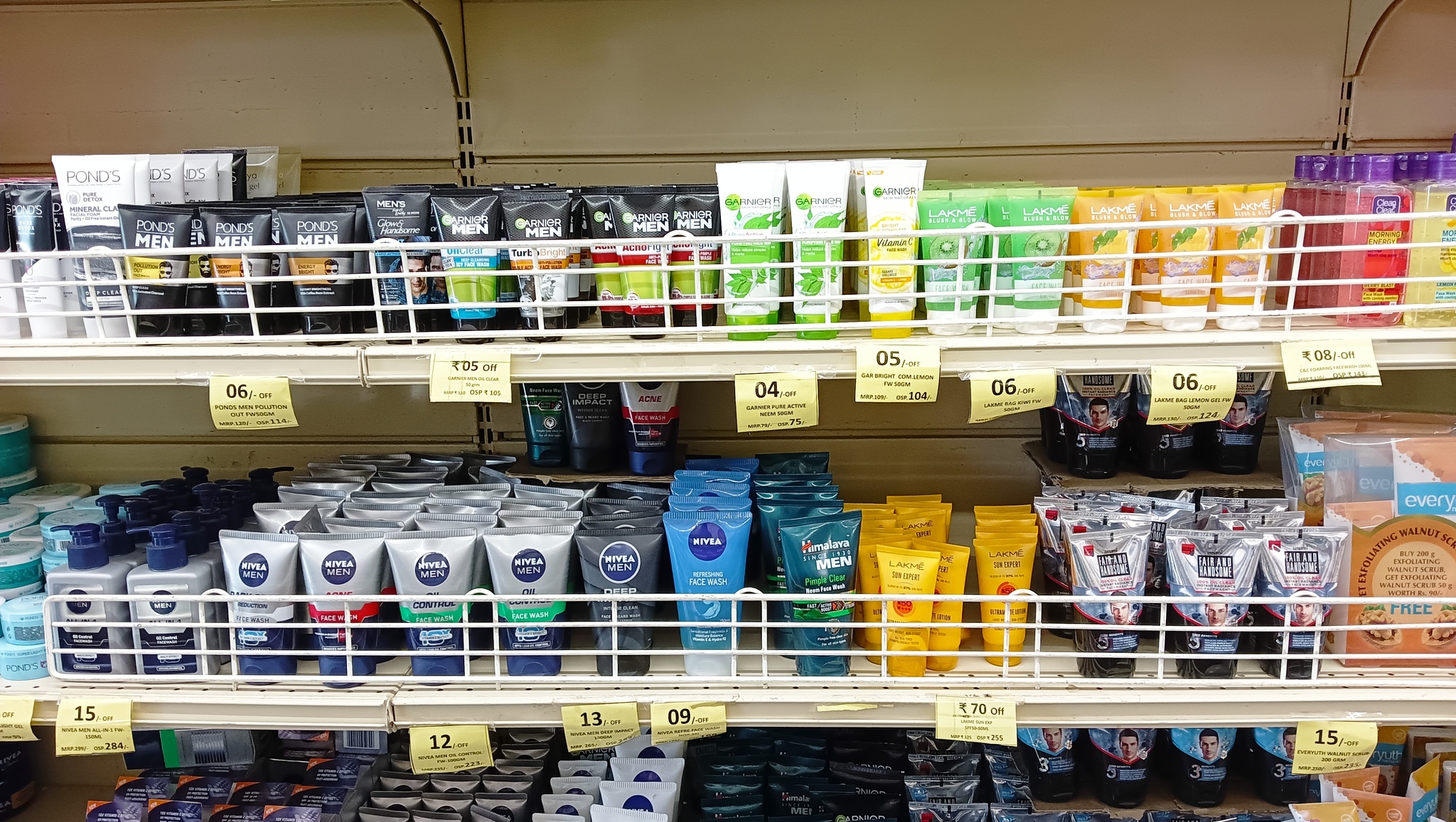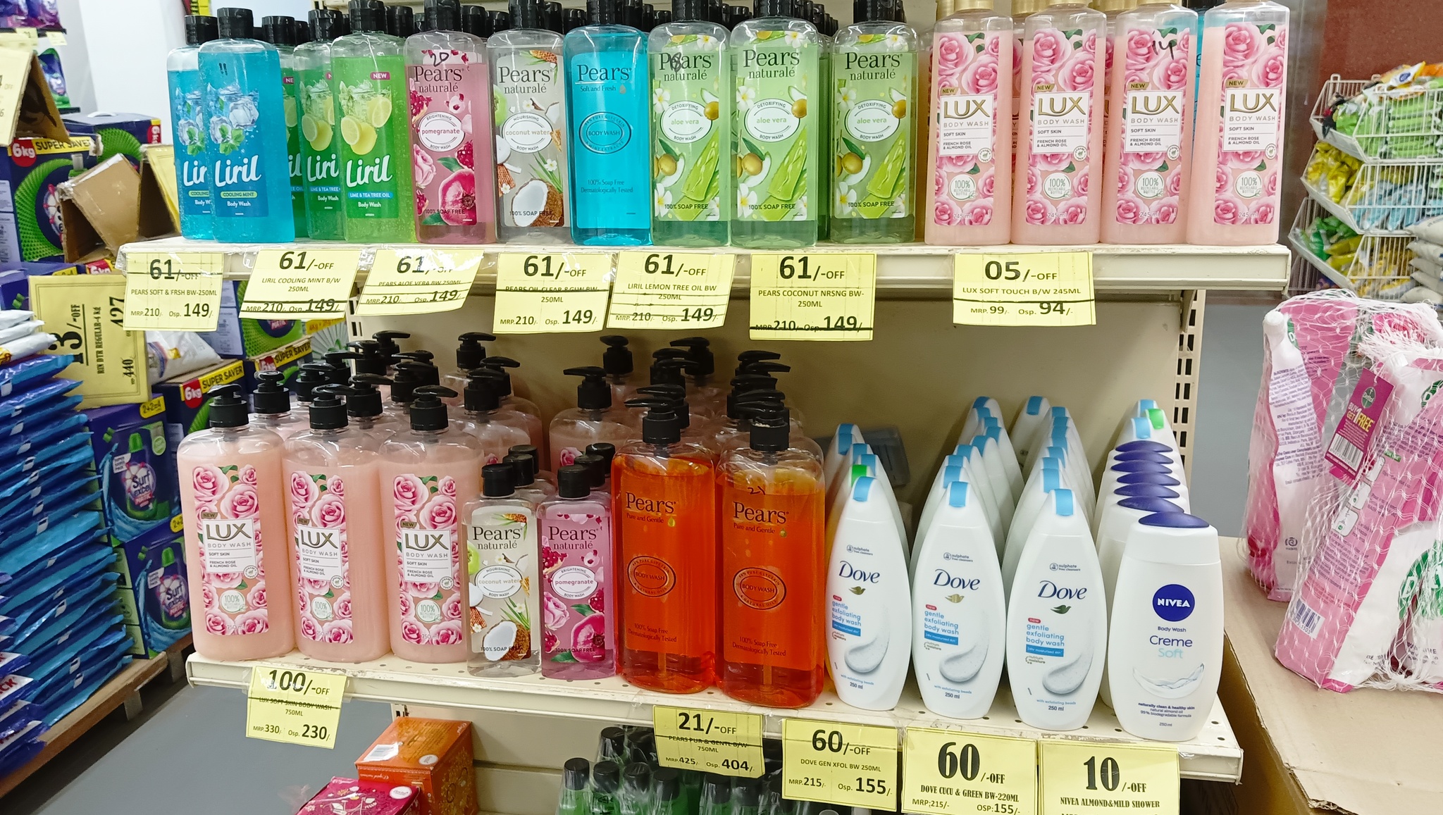 Бытовая химия занимает добрую половину полок магазина. Индийские торговые марки присутствуют, но большую площадь заняли мировые фирмы.