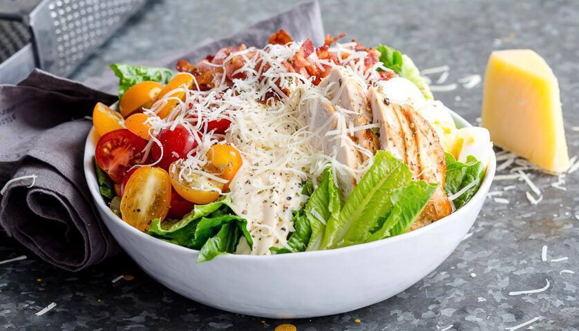 Куриное филе нарежьте ломтиками. Обжарьте ломтики бекона. После бекона обжарьте куриное филе. Для соуса отварите яйцо в течении 2 мин., разбейте в миску, добавьте чеснок, масло, лимонный сок, сыр и взбейте блендером. Салатные листья поместите в миску. Помидоры разрежьте на четвертинки. Листья салата и помидоры полейте соусом и перемешайте. Разложите по тарелкам. Сверху распределите куриное филе и бекон, украсьте сухариками. Посыпьте сыром, сухариками и подавайте.