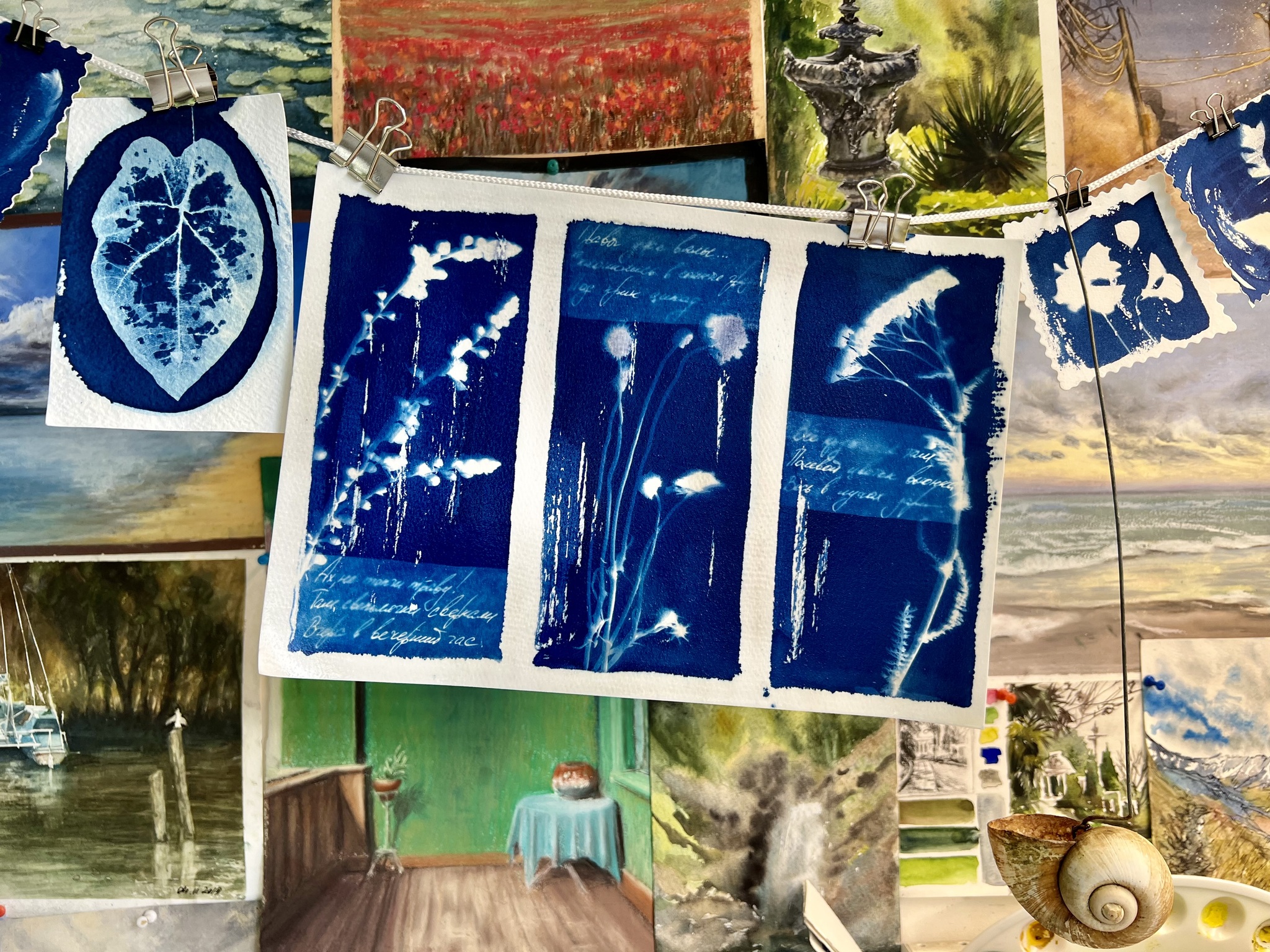 Для повторения опыта вам потребуются реактивы (феррицианид калия и лимонно-аммиачная соль железа, дистиллированная вода или готовые растворы с маркетплейсов), перекись водорода, лимонная кислота, акварельная бумага(она должна выдержать интенсивные полоскания), материалы для печати (гербарий), стекло, кисть, канцелярские зажимы.