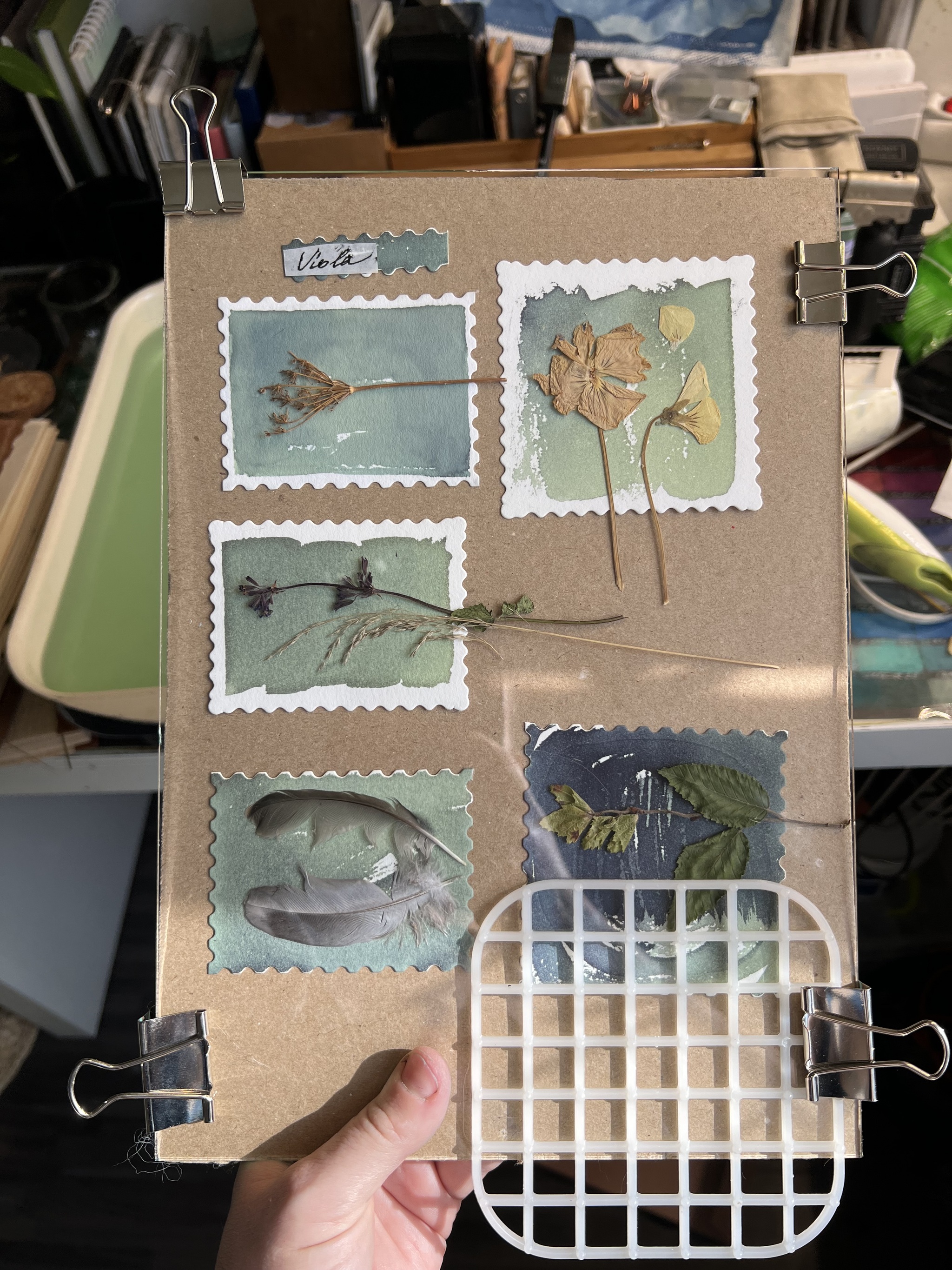 Затем кладем покрытый эмульсией лист на твердую основу (картон или стекло) и начинаем раскладывать композицию. Всю эту красоту накрываем листом стекла, чтоб зафиксировать, и отправляем на солнце на 5-15 минут, в зависимости от желаемой контрастности изображения и интенсивности освещения