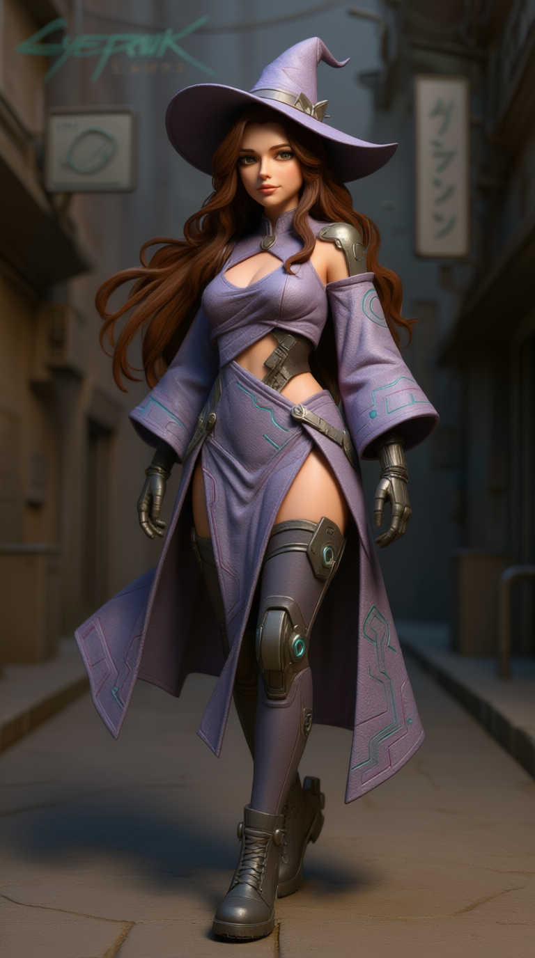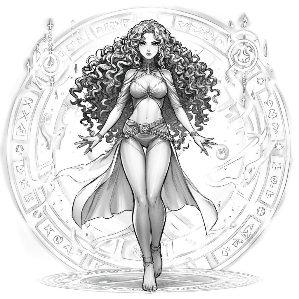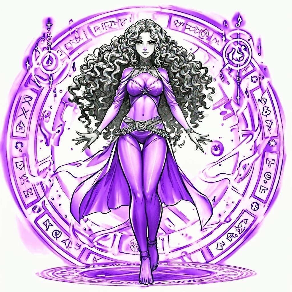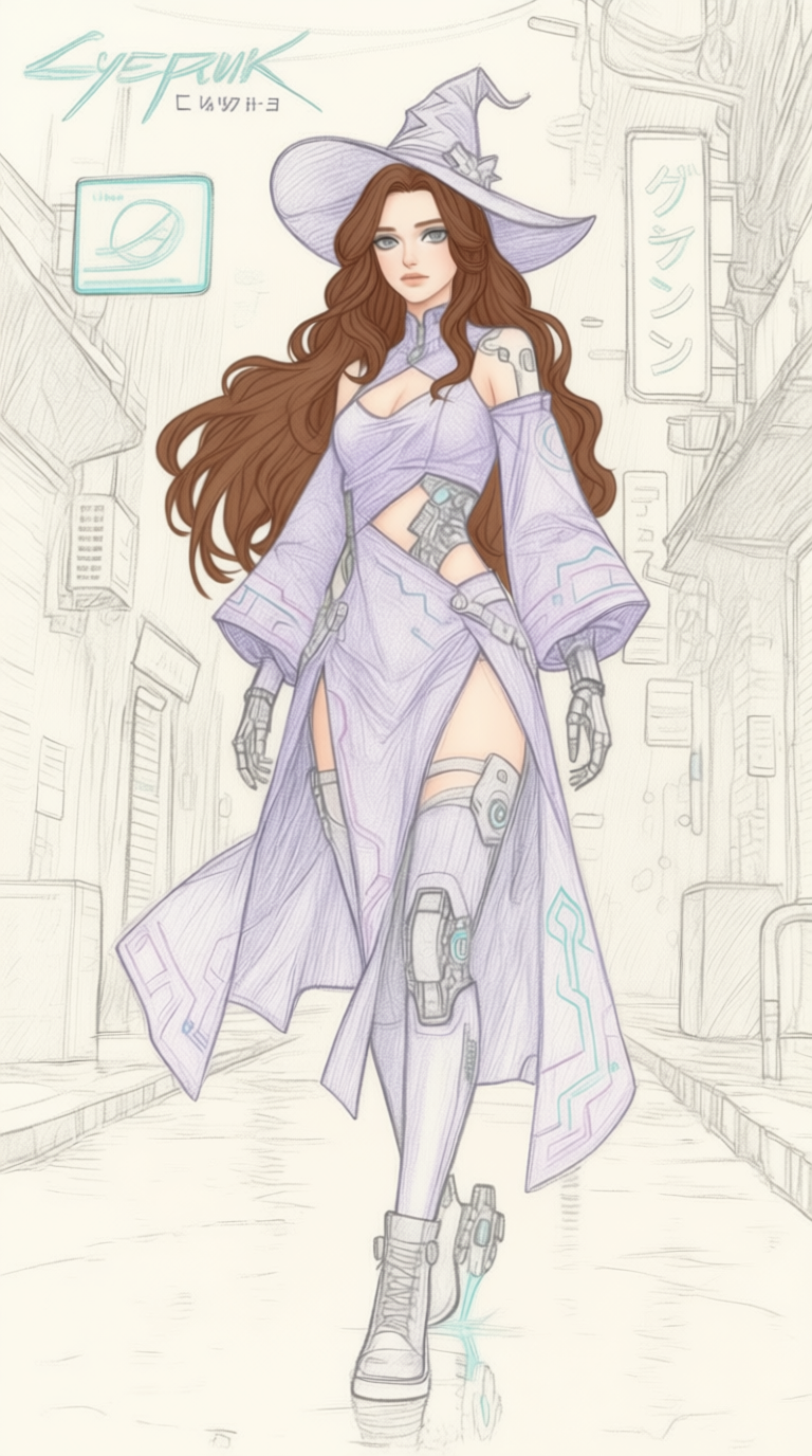Почему без цвета? Так решила нейросеть. На что получила дополнительный комментарий, что эскиз должен быть в цвете и одежда в фиолетовых тонах (чтобы не отходить от концепции).