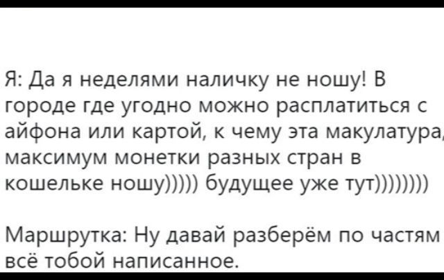 А сколько раз я наблюдал скандалы в автобусе, когда пассажир требовал рассчитать его по безналу, а кондуктор требовал, чтобы безбилетник съебал нахуй с корабля ))