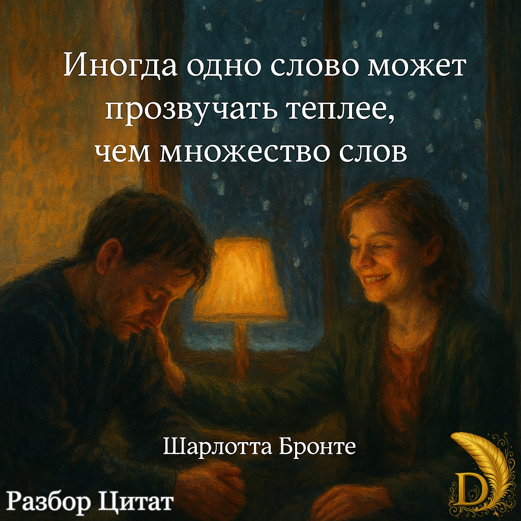 В высказывании Бронте сталкиваются два мира: мир внешнего шума, где слова часто теряют смысл из-за изобилия, и мир внутренней тишины, где одно слово становится мостом между душами. 🕊️ Это не о риторике, а о сердечности. Иногда молчание и одно доброе слово действуют сильнее, чем сотни фраз. Такая эмоциональная сдержанность вызывает глубокое доверие и умиротворение, словно взгляд, который говорит больше слов.