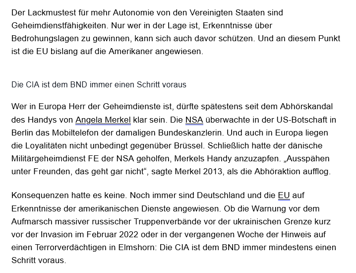 Последствий не было. Германия и ЕС по-прежнему полагаются на разведданные американских служб. Будь то предупреждение о развертывании массивных российских войск на украинской границе незадолго до вторжения в феврале 2022 года или наводка о подозреваемом в терроризме в Эльмсхорне на прошлой неделе: ЦРУ всегда как минимум на шаг опережает БНД.