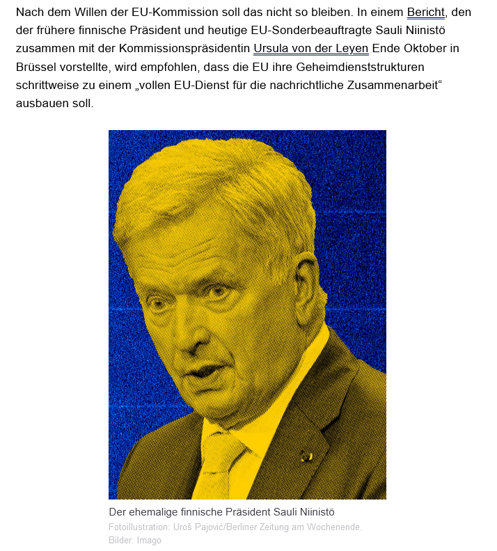 Комиссия ЕС не хочет, чтобы все так и оставалось. В докладе, представленном бывшим президентом Финляндии и нынешним специальным представителем ЕС Саули Ниинистё вместе с председателем Комиссии Урсулой фон дер Ляйен в Брюсселе в конце октября, рекомендуется, чтобы ЕС постепенно развивал свои разведывательные структуры в «полноценную службу разведывательного сотрудничества ЕС».