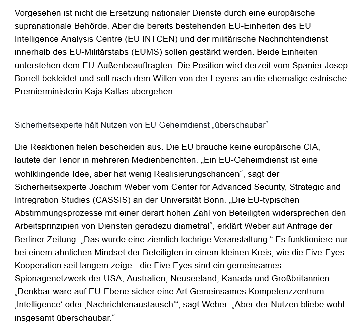 Реакция была сдержанной. ЕС не нужно европейское ЦРУ, - таков был тон нескольких сообщений в СМИ. «Секретная служба ЕС - это красиво звучащая идея, но у нее мало шансов на реализацию», - говорит эксперт по безопасности Йоахим Вебер из Центра перспективных исследований в области безопасности, стратегии и интраграции (CASSIS) при Боннском университете. «Типичные для ЕС координационные процессы с таким большим количеством участников диаметрально противоположны принципам работы сервисов», - объясняет Вебер, отвечая на вопрос Berliner Zeitung. Это привело бы к тому, что мероприятие получилось бы довольно дырявым». Это работает только в том случае, если участники имеют схожий менталитет в узком кругу, как уже давно показало сотрудничество «Пяти глаз» - совместной сети шпионажа США, Австралии, Новой Зеландии, Канады и Великобритании. «Некий совместный центр компетенции по разведке или обмену разведданными, конечно, можно было бы создать на уровне ЕС», - говорит Вебер. «Но общая выгода, скорее всего, будет незначительной».