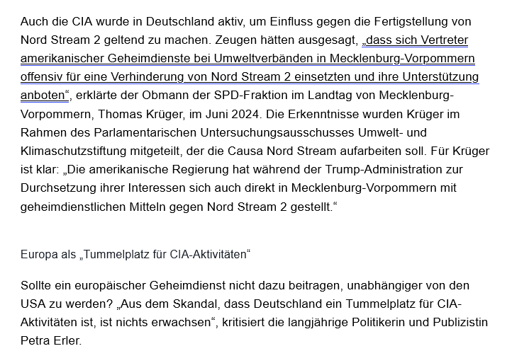ЦРУ активно действовало и в Германии, чтобы оказать влияние против строительства «Северного потока - 2». Свидетели показали, «что представители американских секретных служб активно лоббировали экологические организации в Мекленбурге-Передней Померании, чтобы предотвратить строительство „Северного потока - 2“, и предлагали свою поддержку», - пояснил в июне 2024 года Томас Крюгер, председатель парламентской группы СДПГ в парламенте земли Мекленбург-Передняя Померания. Крюгер был проинформирован об этих выводах в рамках работы парламентского комитета по расследованию деятельности Фонда защиты окружающей среды и климата, которому поручено расследовать дело «Северного потока». Для Крюгера ясно одно: «Во время правления Трампа правительство США также использовало спецслужбы для прямого противодействия Nord Stream 2 в Мекленбурге-Передней Померании, чтобы отстаивать свои интересы».