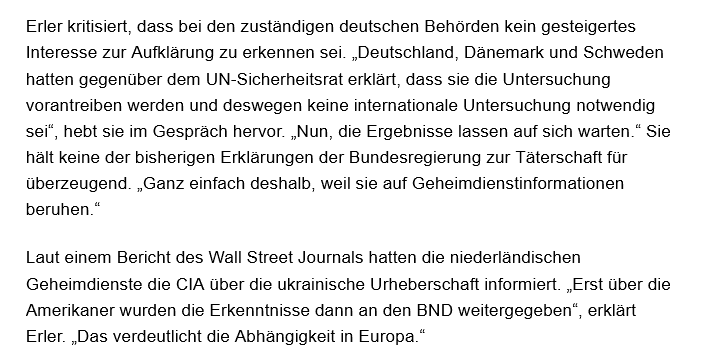 Эрлер критикует тот факт, что ответственные немецкие власти не проявили повышенного интереса к расследованию этого дела. «Германия, Дания и Швеция заявили Совету Безопасности ООН, что они будут продолжать расследование, и поэтому нет необходимости в международном расследовании», - подчеркнула она в интервью. «Только результаты заставляют себя ждать». Она не считает убедительными ни одно из предыдущих заявлений немецкого правительства о виновных. «Просто потому, что они основаны на разведывательной информации».