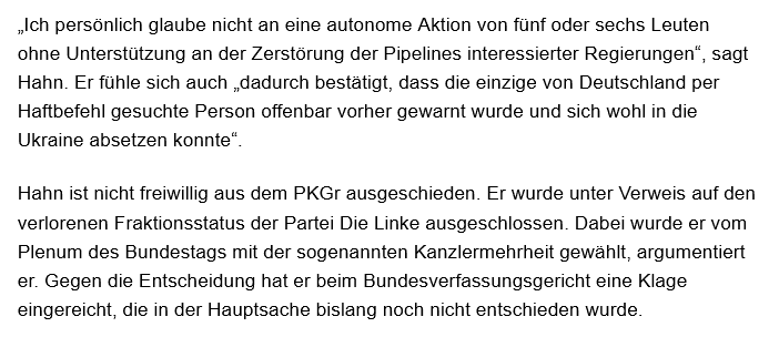 «Лично я не верю в автономную акцию пяти-шести человек без поддержки правительств, заинтересованных в разрушении трубопроводов», - говорит Хан. Он также считает « себя оправданным тем фактом, что единственный человек, которого Германия разыскивает по ордеру на арест, был, очевидно, предупрежден заранее и, вероятно, смог бежать на Украину».