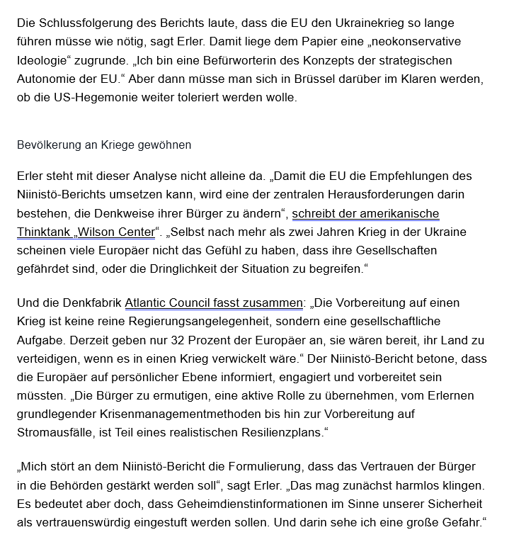 Вывод доклада заключается в том, что ЕС должен вести войну на Украине так долго, как это необходимо, считает Эрлер. Это означает, что документ основан на «неоконсервативной идеологии». «Я выступаю за концепцию стратегической автономии ЕС». Но тогда Брюсселю придется понять, хочет ли он и дальше мириться с гегемонией США.