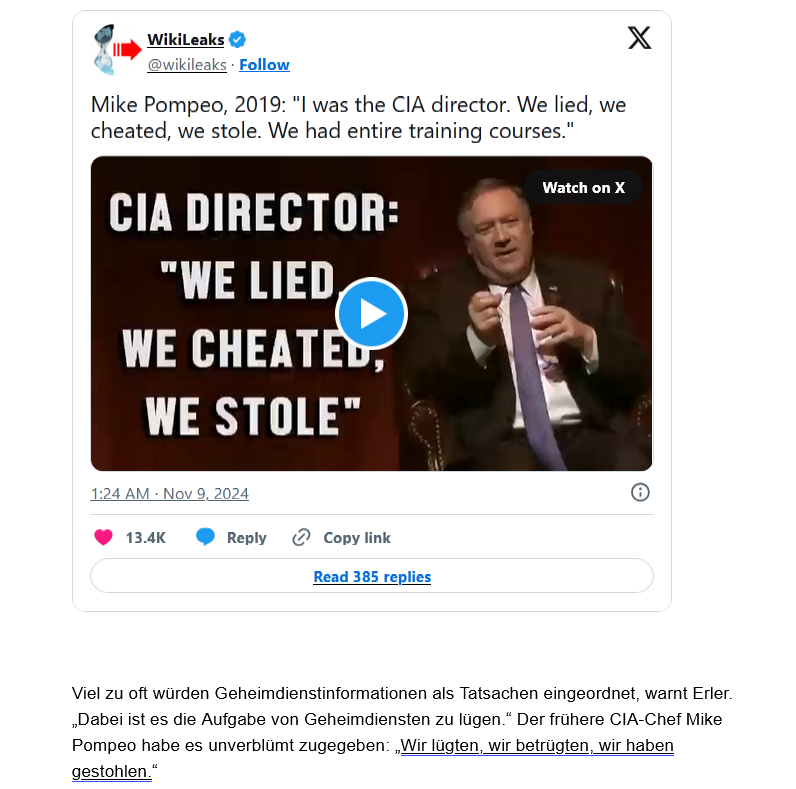Слишком часто разведывательная информация классифицируется как факт, предупреждает Эрлер. «Но это работа спецслужб - лгать». Бывший глава ЦРУ Майк Помпео прямо признал это: «Мы лгали, мы обманывали, мы крали».